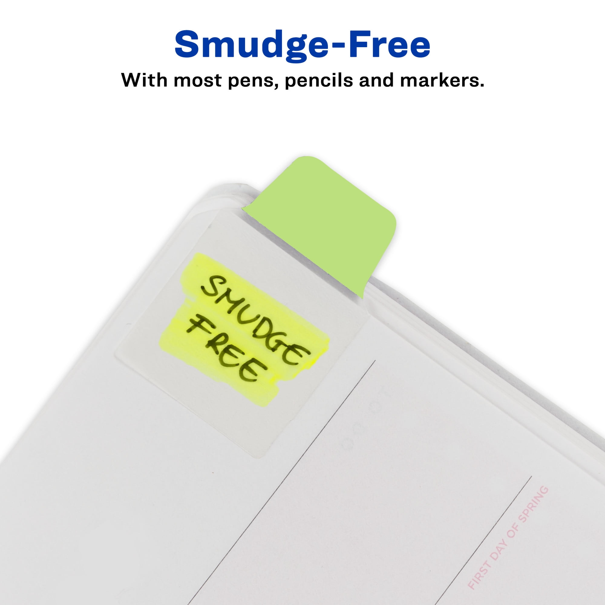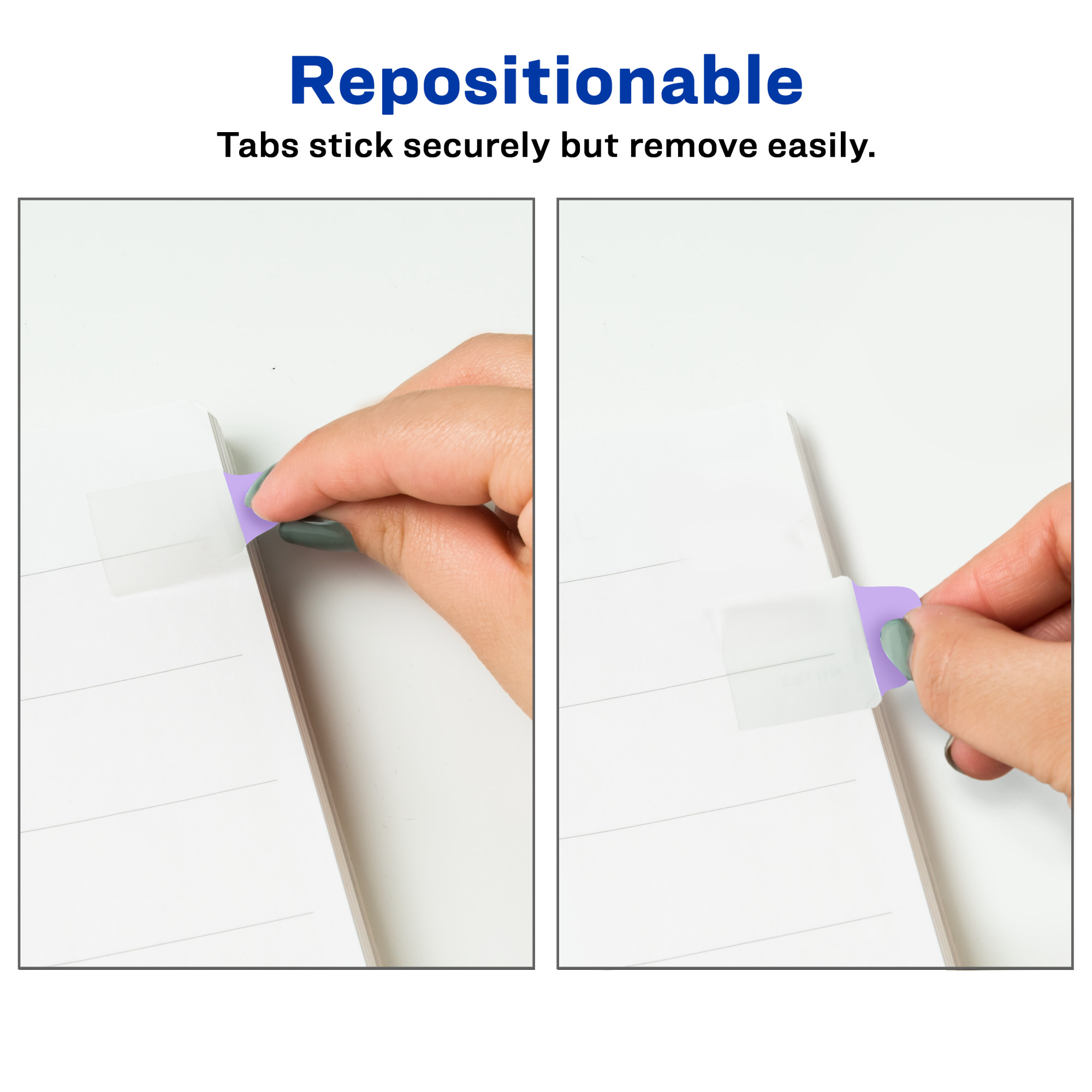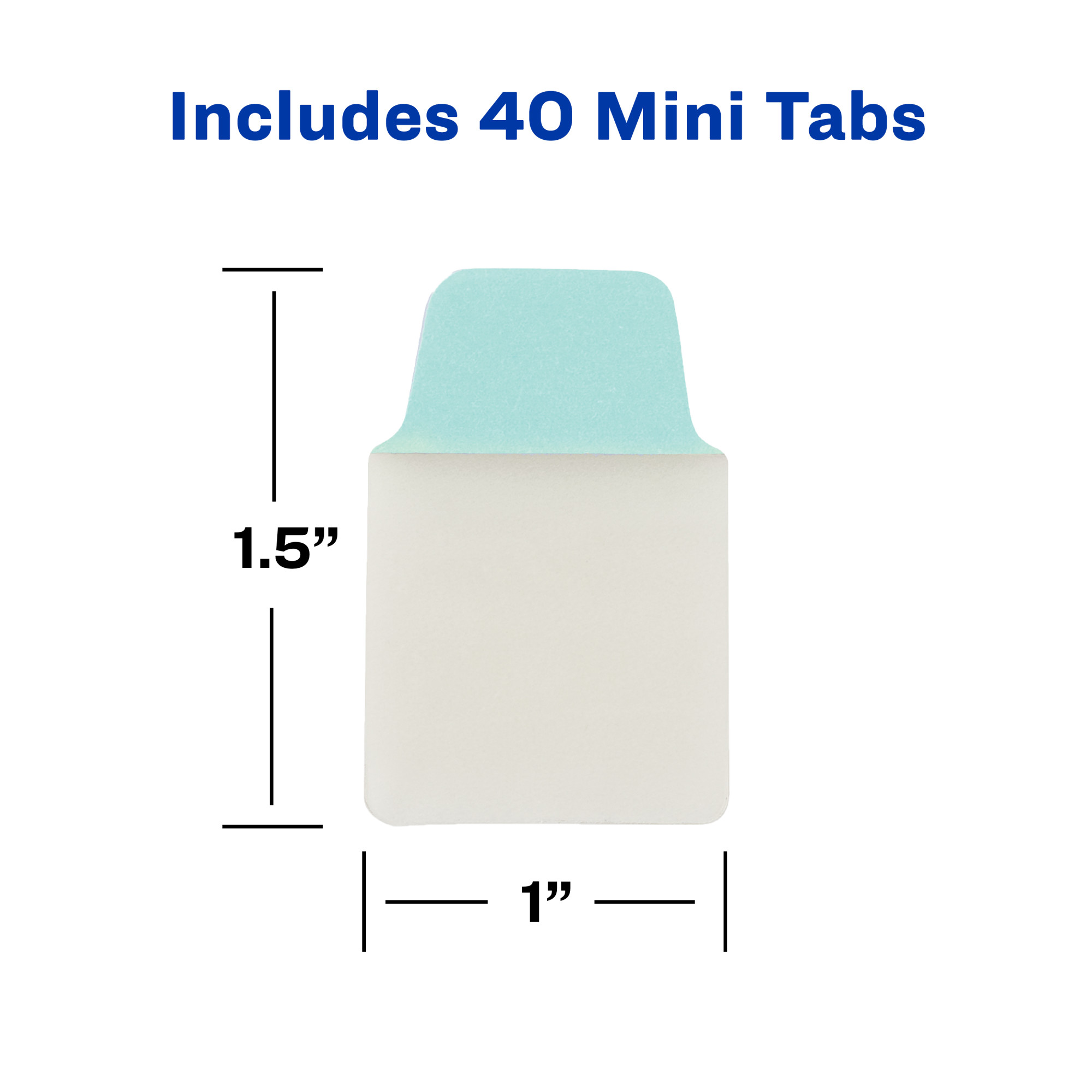 Avery Mini Ultra Tabs are durable tabs that make indexing, flagging and referencing documents quick and easy with a smaller size that won’t get in the way of text or each other. These sturdy tabs are writable on both sides and the clear adhesive body does not interfere with any text or graphics underneath. Get crisp and clear writing on the smudge free* page markers with most pens, pencils, markers and highlighters. The repositionable tabs stick securely to any page, yet remove easily for multiple uses. Use at home, in the office or at school as page flags, bible tabs, file folder tabs, divider tabs and more! The pack of 40 pastel color tabs includes 10 purple, 10 blue, 10 pink and 10 green 1" x 1.5" tabs. *Ink dry times may vary. Tab may lift some inks. Test before applying.
