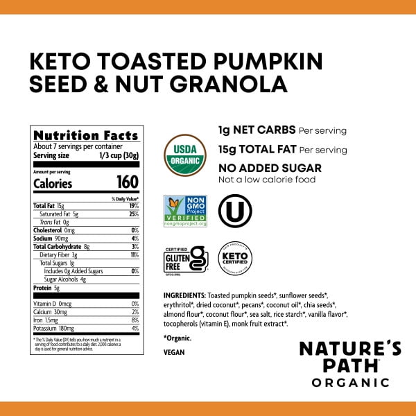 Ketola Crunch Toasted Pumpkin Seed and Vanilla Nut Granola is super-delicious – snack on the go or pour into a bowl with your choice of toppings. Made with simple, Keto diet-friendly, vegan, gluten-free, organic, and non-GMO ingredients, this Nature’s Path Ketola Crunch Granola is packed with pumpkin seeds, sunflower seeds, chia seeds, pecans, dried coconut, monk fruit, and vanilla for a fiber- and protein-rich breakfast or snack without extra carbs or added sugar.