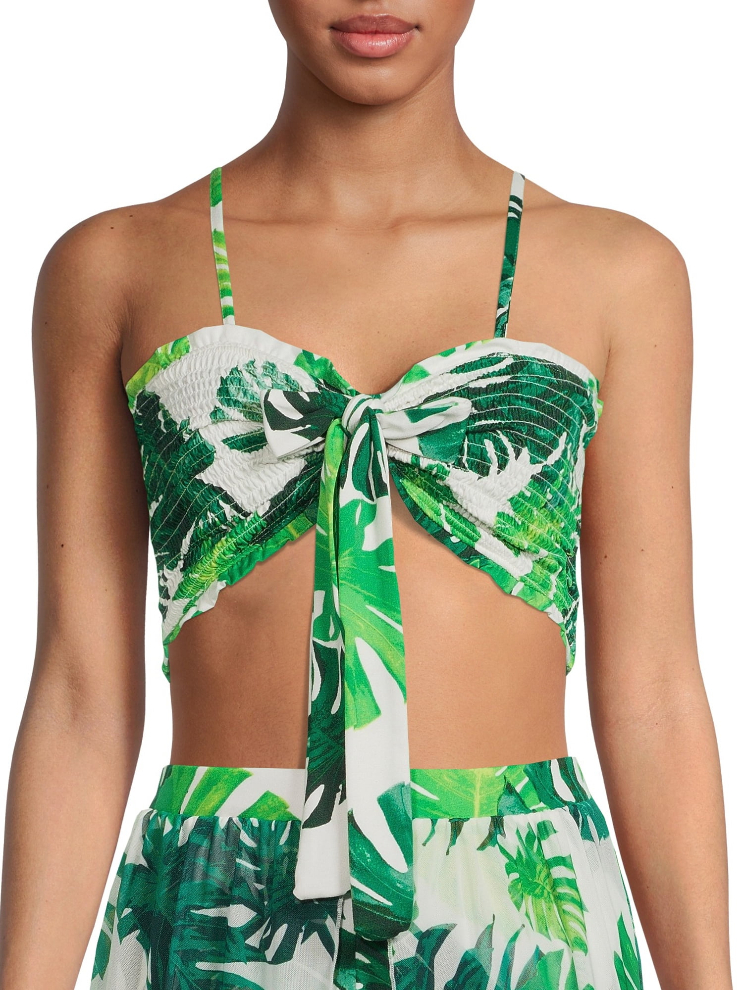 - Crop top: Pullover style; sweetheart neckline; bow detailing at front; shoulder straps; contrast prints