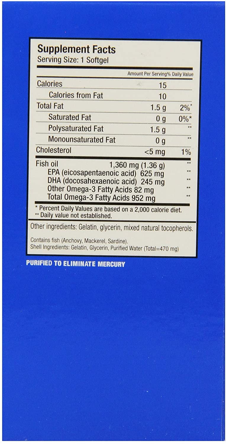 A daily dietary supplement formulated to provide high quality EPA, DHA, GLA and ALA. Triple strength Omega 3 formula supports overall well-being Anti-inflammatory properties may promote joint and skin health.Active Ingredients: 1 Softgel: Calories 10; Calories From Fat 10; Total Fat 1 g; Cholesterol 5 mg; Fish Oil 1,000 mg (1 g); EPA (Eicosapentaenoic Acid); DHA (Docosahexaenoic Acid); Total Omega-3 Fatty Acids 300 mg Uses: Helps support healthy joints, healthy cholesterol*. Enteric coated. No repeat, cold water, fish oil. Purified to eliminate mercury.