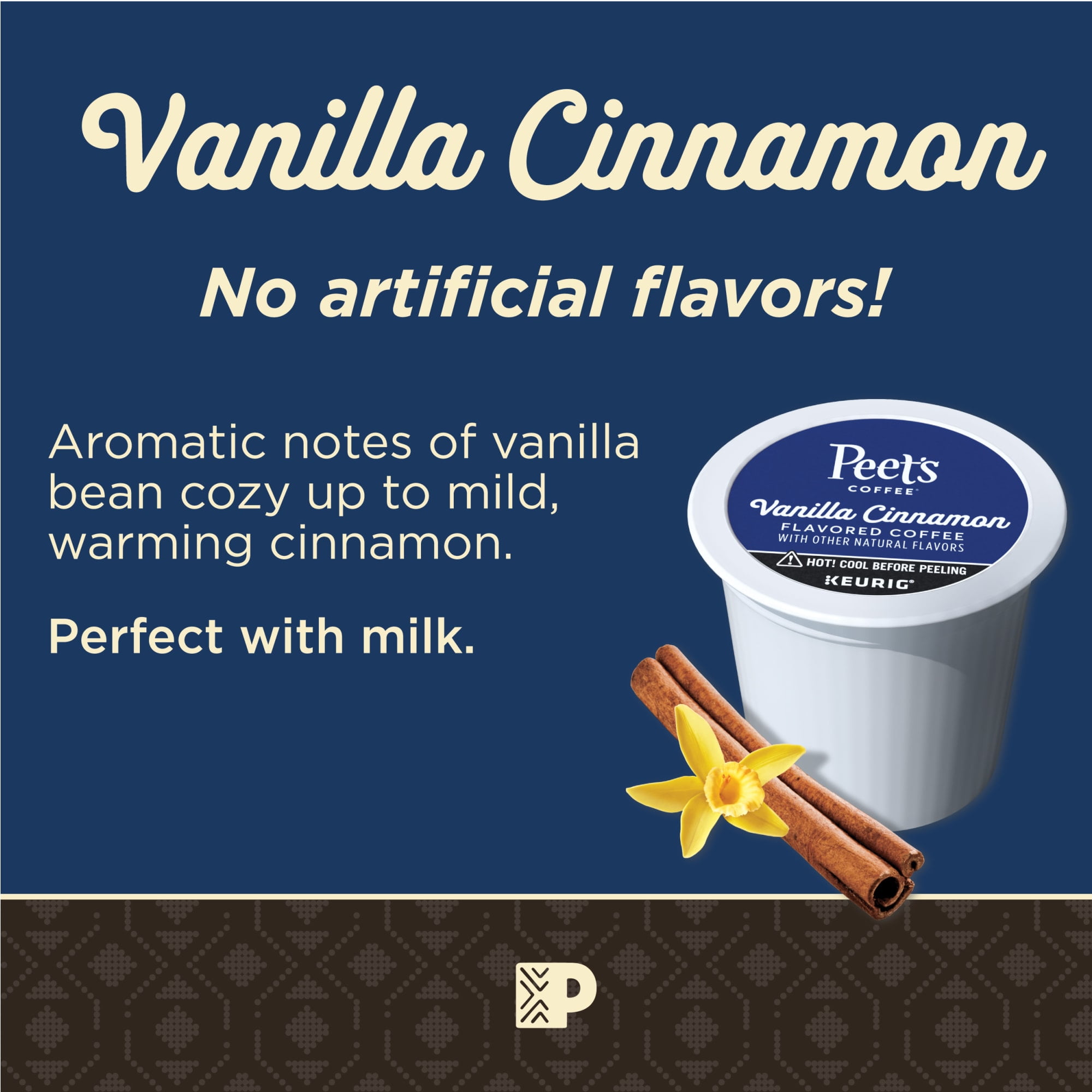 - Contains one (1) Boxes of 22 K-Cup pods of Peet’s Vanilla Cinnamon flavored coffee.
