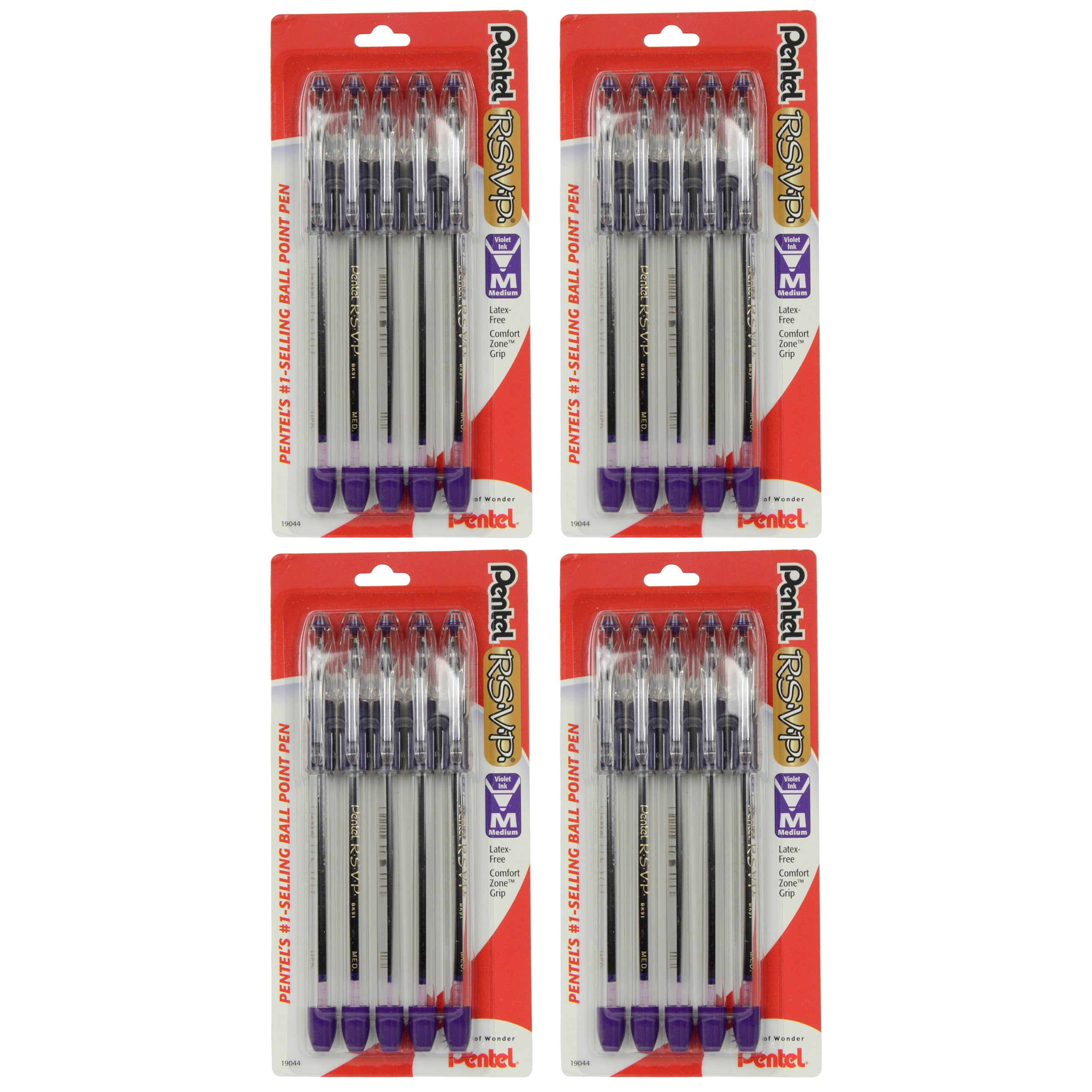 This set of Pentel RSVP ballpoint pens writes with deep violet purple ink. This purple ink Pentel pen writes with a 1.0mm medium line for precise marking. This 5pc set of purple pens features an ergonomic design with a latex-free comfort grip. This refillable ballpoint pen accepts Pentel BKL10 pen refills, and the long barrel of the BK91BP5V pen ensures that refills are less frequent than the competition.