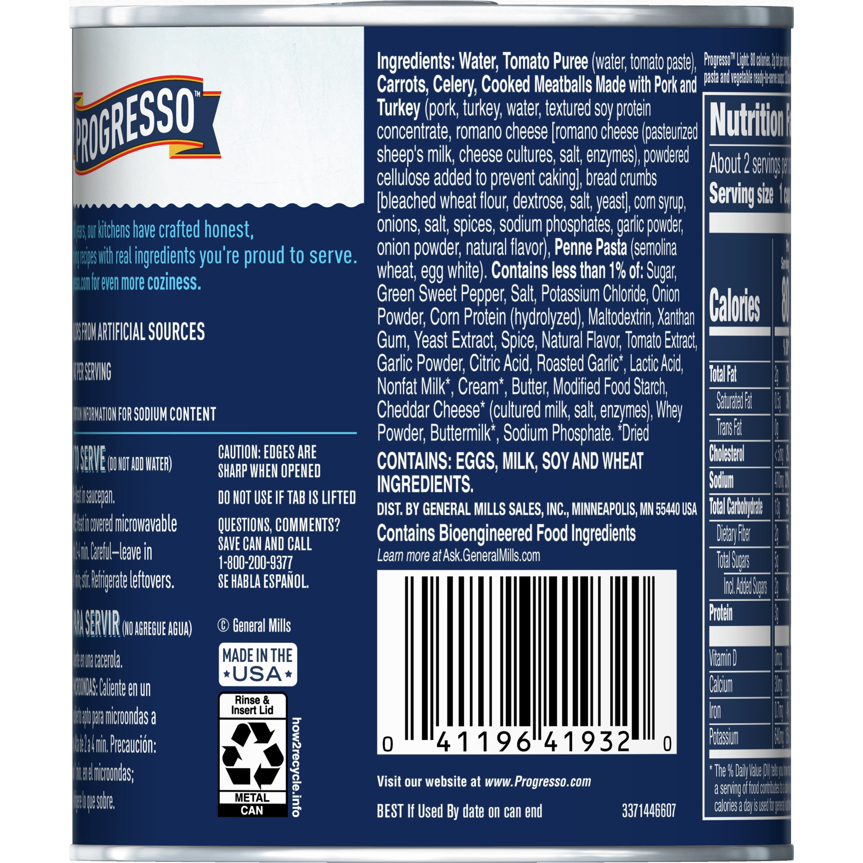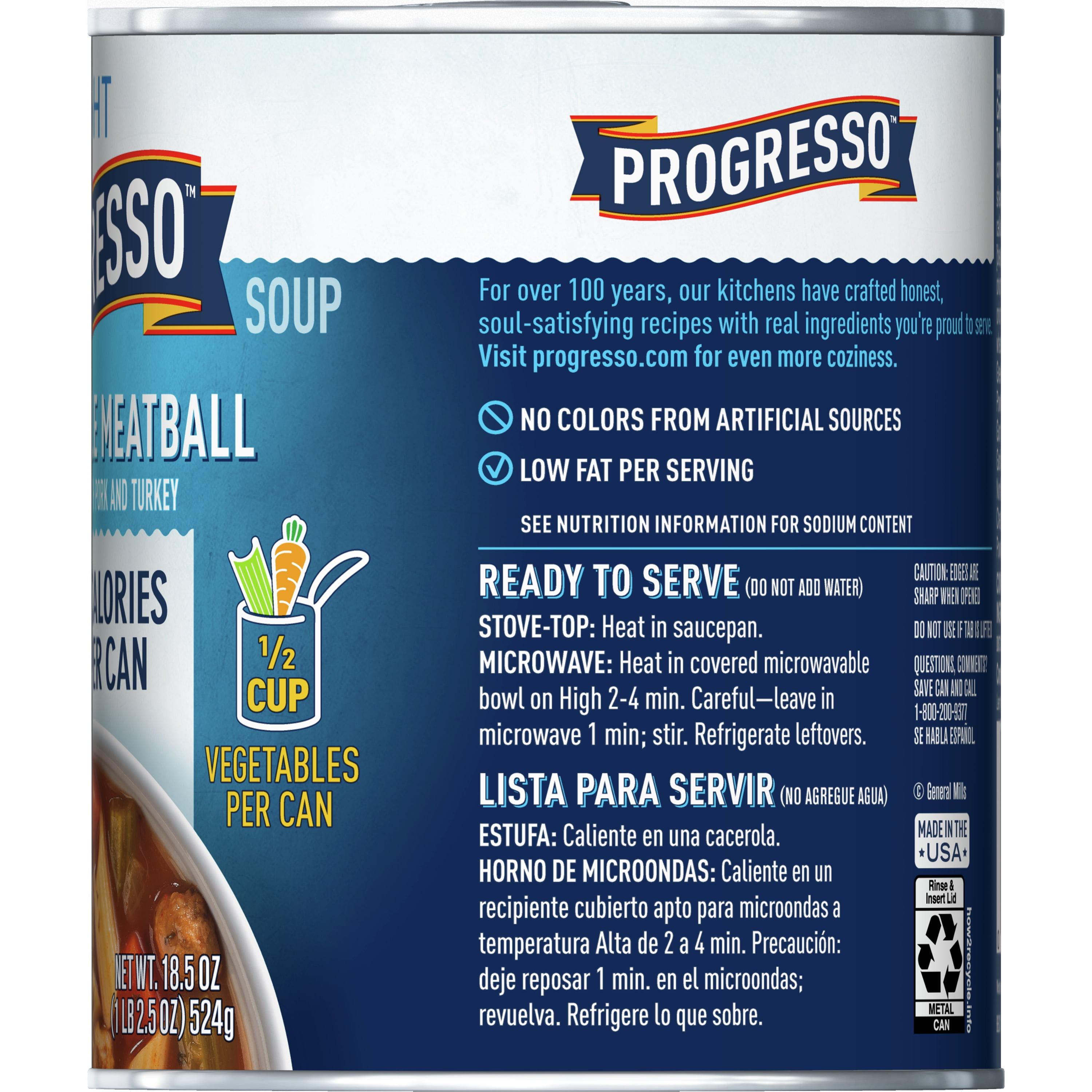 Progresso Light Italian Style Meatball Soup has at least 33% fewer calories than regular ready-to-serve soups. Our recipe is packed with classic flavors and quality ingredients for the whole family to enjoy.