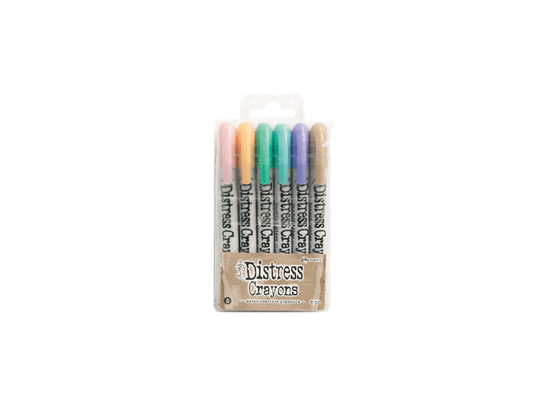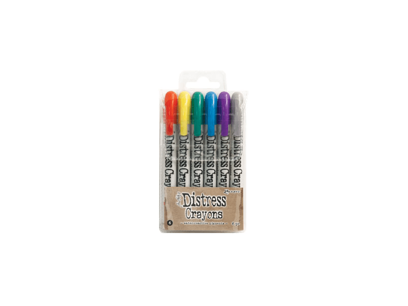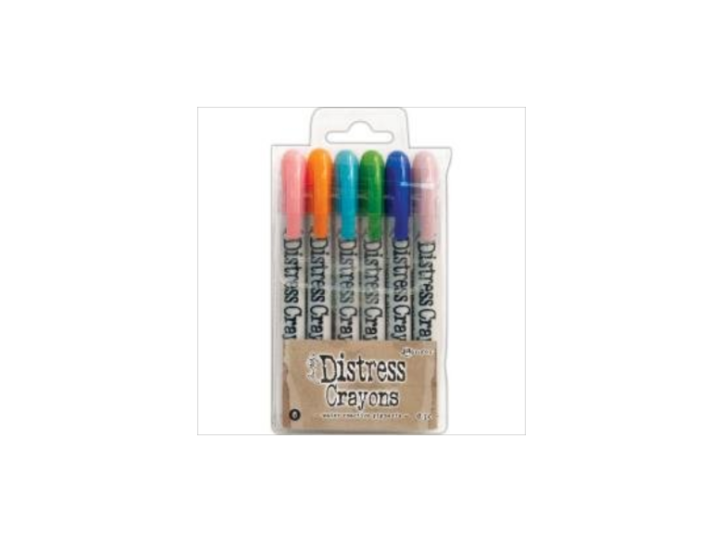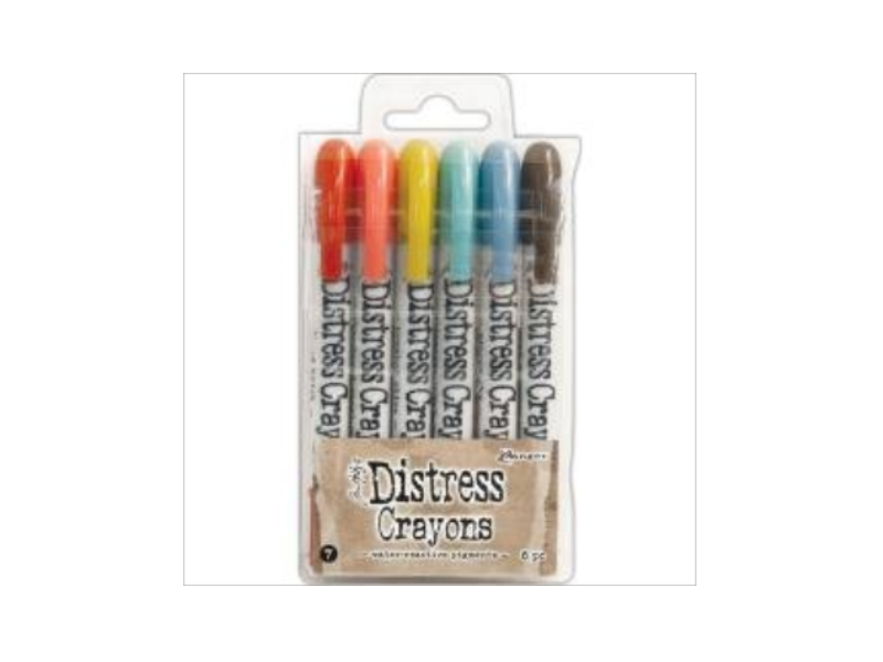 Ranger-Tim Holtz Distress Crayon Set: Set No.1. These crayons are formulated to achieve vibrant coloring effects on porous surfaces for mixed media. Ideal for creating brilliant backgrounds, watercoloring, smudge effects and more. This package contains six 5-1/4 inch long water-reactive pigment crayons in assorted colors. Non-toxic. Conforms to ASTM D4236.