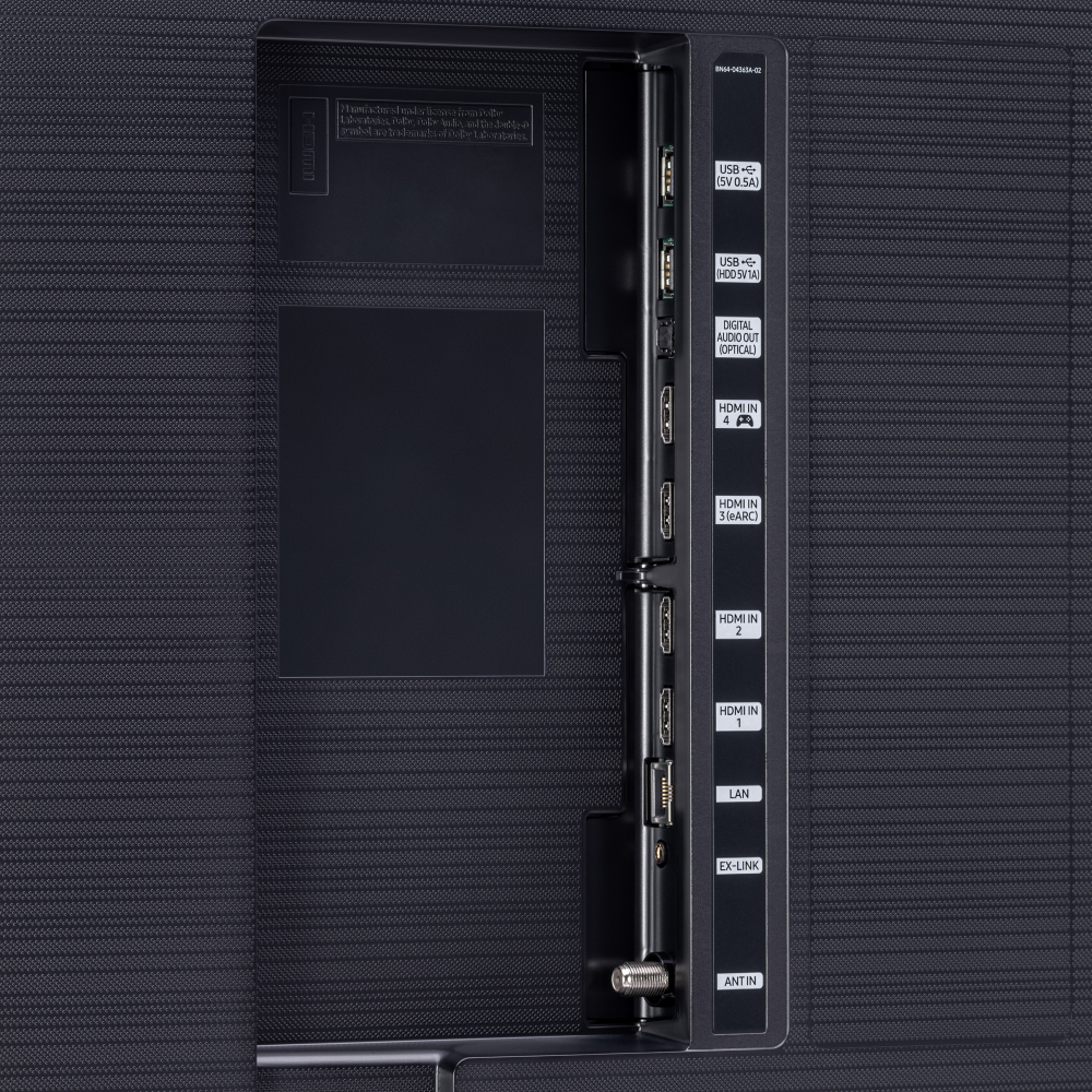 - Two top and two bottom built-in TV speakers adjust the sound to follow the action.