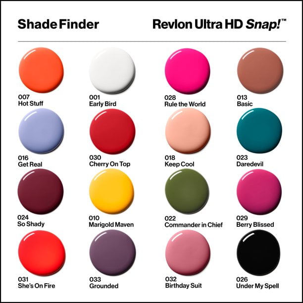 - Revlon Ultra HD Snap Nail Colors, Natural Rich Glossy Nail Polish, 100% Vegan Formula, No Base and Top Coat Needed, 031 She’s on Fire, 0.27 fl. Oz. (Pack of 2)