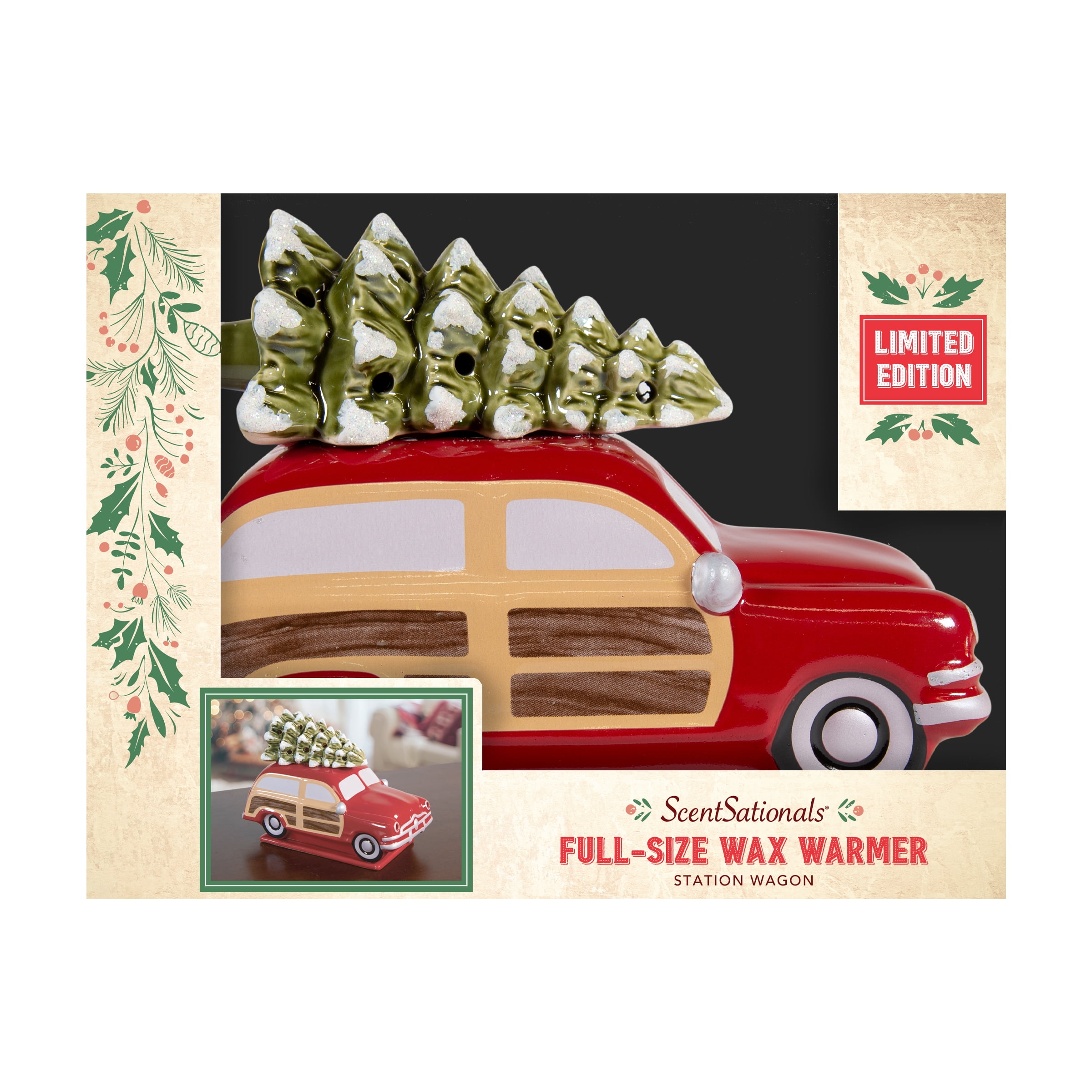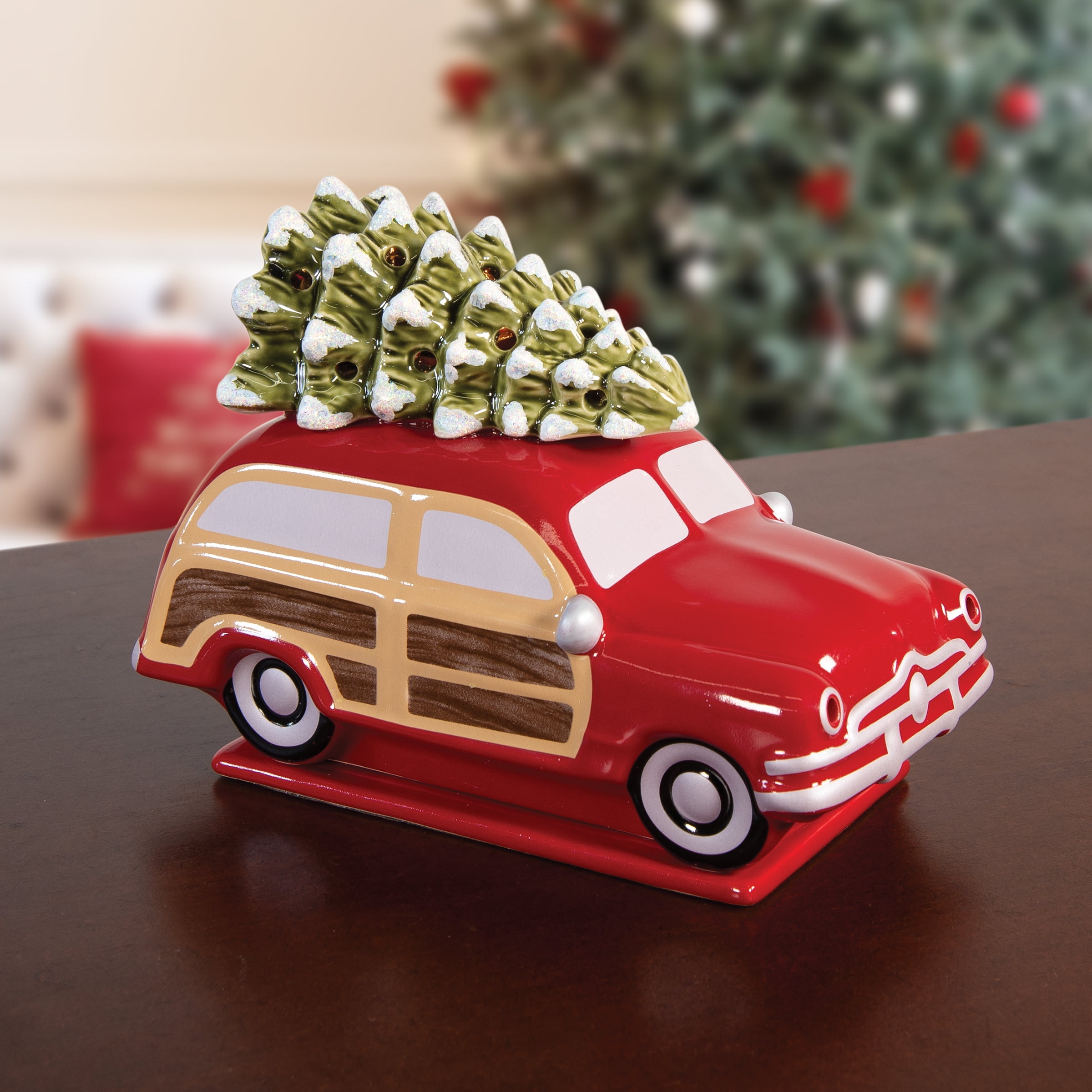 The ScentSationals Station Wagon Full Size Wax Warmer brings Holiday joy right to your home. The Station Wagon warmer is a ceramic molded warmer that is hand painted for a unique one of a kind piece. The red body is adorned with wood grain panels, silver windows, topped with a snowy Christmas tree. The tree is covered in textured snow and glitter that sparkles in the light. It gently melts scented wax, releasing aromatic scents that fill an entire room with inviting warmth. It produces a soft glow from inside when plugged in. The soft 20W light provides a relaxing, decorative atmosphere and melts your choice of fragrance wax cubes. The light also shines through the headlights making is feel like a real station wagon. The Station Wagon is an inverted warmer. The wax dish is underneath the car for easy cleanup. The fragrance wax warmer creates a relaxing atmosphere while giving you a safe heat source to melt your choice of fragrance wax melts (sold separately). The use of an electric light makes this a safe way to heat your fragrance with no soot or residue. This ScentSationals Station Wagon Wax Warmer is perfect for adding the right amount of ambience and fragrance to your Holiday Decor.