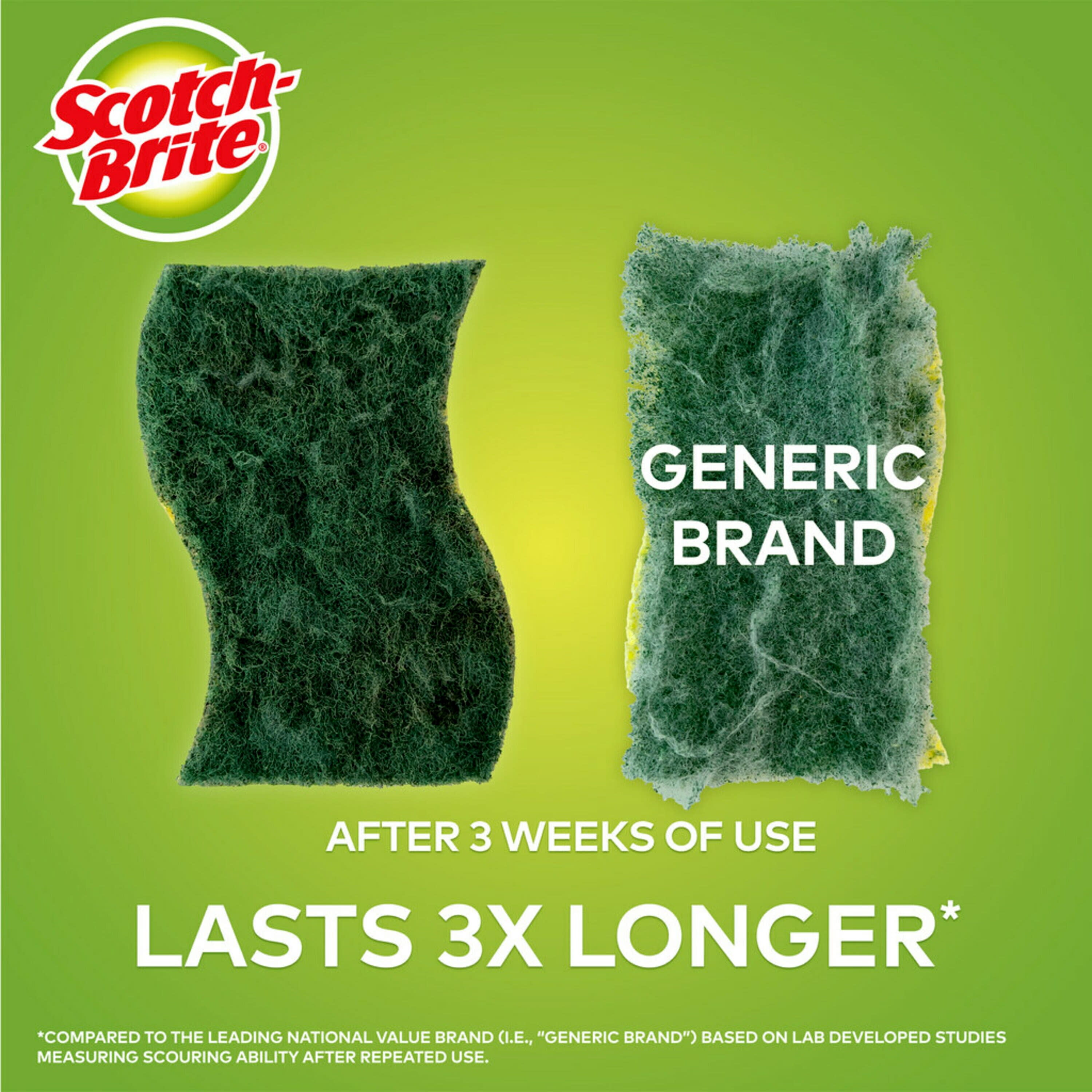 Experience a gratifying clean with Scotch-Brite Heavy Duty Scrub Sponges. These scrubber sponges have 3x more scrubbing power compared to leading temperature-reactive sponges [based on lab-developed studies measuring scouring ability after repeated use]. Use these tough heavy duty scrubbing sponges for cleaning grease, grime and dirt on safe-to-use surfaces, such as non-coated cookware, oven racks, concrete and tools. Even the messiest of dishes and surfaces will shine like new with a quick and easy scrub from these versatile kitchen sponges. The scrubbing fibers of these heavy duty scrub sponges are made from 100% recycled content for a sustainable clean. Make sure to replace your scrubber sponge every three weeks to get the best performance. To clean, simply put the scrubbing sponge you are using in the dishwasher top rack to sanitize and reuse it. Please note that some product packaging of the scrubbing sponges may look different from the images displayed. One package contains six scrub sponges, so you can buy them in bulk and not have to make a trip to the store every time you need to replace your sponges. Stock up your cleaning supplies with Scotch-Brite Heavy Duty Scrub Sponges and see why Scotch-Brite is the beloved cleaning brand for many households. Scotch-Brite gives you the power to clean up life’s everyday messes — in the kitchen and beyond. From everyday jobs to cleaning hacks, you’ll see why Scotch-Brite Brand is America’s #1 selling scrub sponge brand.