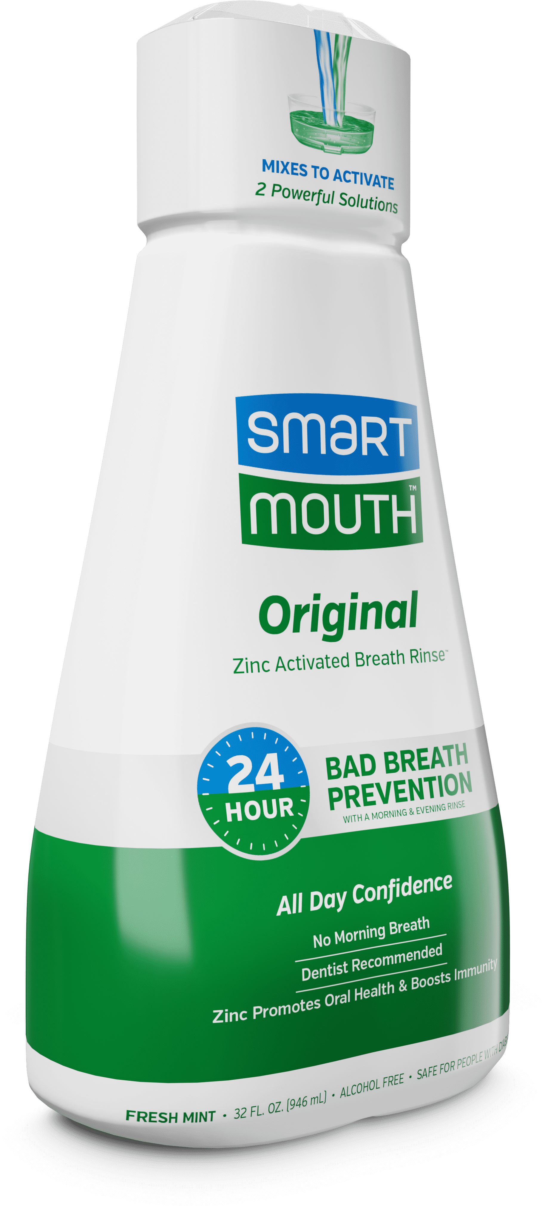 - Mixes to Activate: 2 powerful solutions. 24 hour. Bad breath prevention with a morning & evening rinse. All day confidence. No morning breath. Dentist recommended. Zinc promotes oral health & boosts immunity. Alcohol free. Safe for people with diabetes. Why 2 Separate Solutions? The power of Smart Mouth is in the Activation. Pour the two solutions together to activate the Smart-Zinc, which eliminates and prevents bad breath for at least 12 hours with each rinse. SmartMouth Oral Health Laboratories. Satisfaction Guarantee: For complete guarantee terms, visit https://smartmouth.com/satisfaction-guarantee/. www.smartmouth.com. Questions or Comments? Call 1-800-492-7040; www.smartmouth.com. Please recycle.