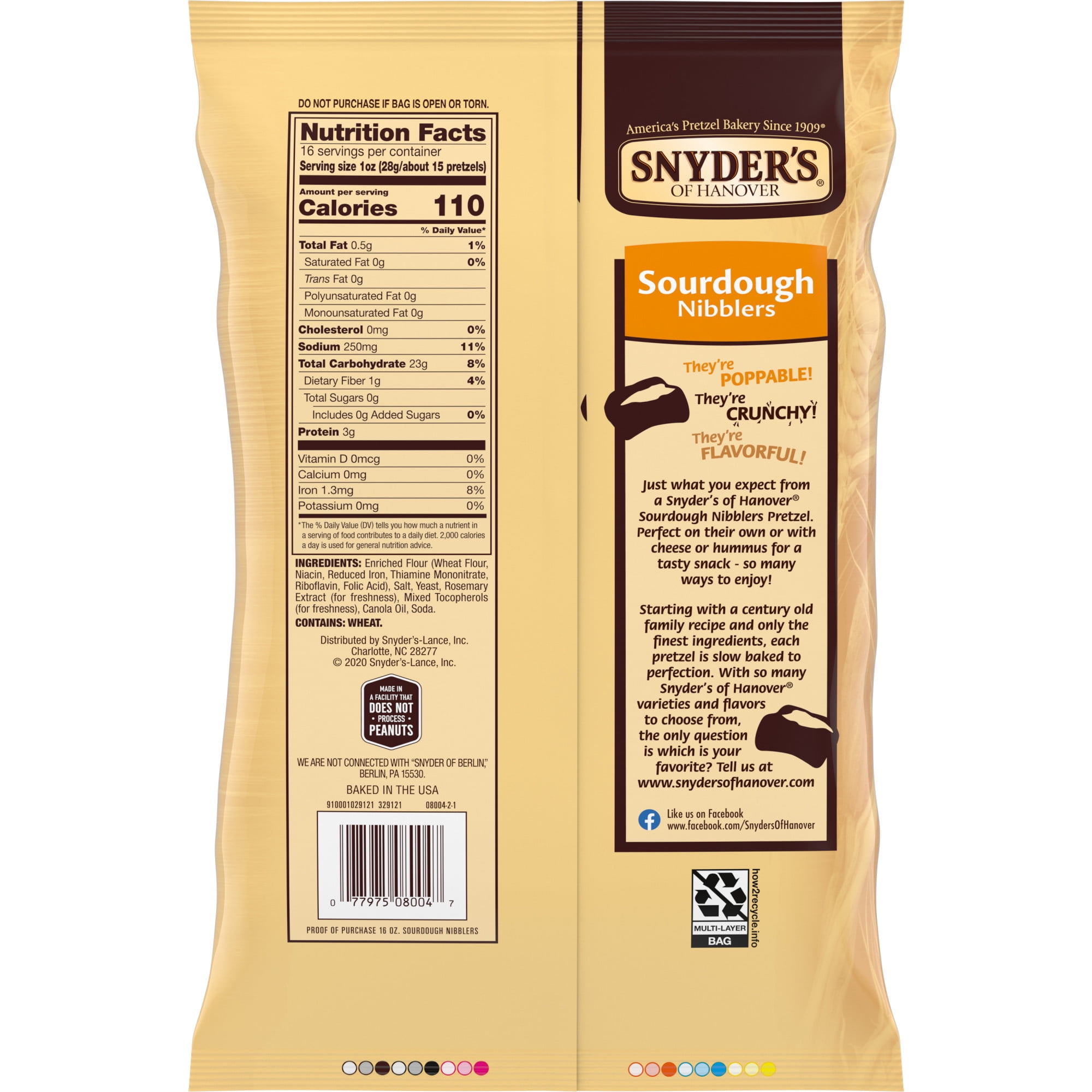 All the flavor of genuine, aged sourdough in a crunchy, bite-size shape. Sourdough Pretzel Nibblers from Snyder’s of Hanover are slow-baked and packed with delicious flavor. We bake every pretzel nugget to the highest level of quality from a 100-year-old family recipe. They are are a perfect snack with hummus, cheese spreads, or warm dip to serve at family gatherings or while watching the big game. These small pretzel nuggets are also a great complement to soups and salads at lunch time. Plus, they’re fat-free, Non-GMO Project Verified and made in a facility that does not process peanuts. Snyder’s has been America’s Pretzel Bakery since 1909 – that’s how we perfected that one-of-a-kind flavor and crunch. Each pretzel is created from wholesome ingredients, kneaded and oven-baked to seal in all the goodness. It’s no wonder our snacks have been shared across tables, between generations, from one end of the country to the other – making us America’s favorite pretzel brand. This 16-ounce Family Size Bag of Snyder’s Sourdough Nibblers has plenty for sharing with friends and family. Feed all your flavor cravings with Snyder’s pretzel snacks. Go ahead, and make some noise!