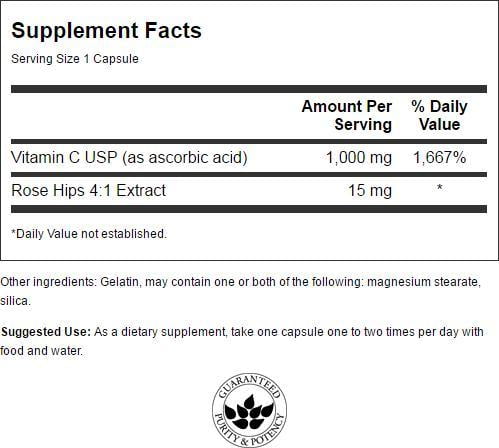Swanson Vitamin C with Rose Hips is the perfect pair to give your immune system a boost of antioxidants. These convenient capsules work phenomenally on-the-go or at home to help fortify your immune health. This high potency formula provides 1,000 mg of vitamin C with 15 mg of rose hips extract in each capsule, making it simple to reap the benefits of vitamin C . But why rose hips? This fruit contains bioflavonoids to enhance antioxidant potency, making this a dynamic duo to help to support your immune system and keep your body’s natural defenses locked and loaded for whatever life throws at you. These convenient capsules deliver vitamin C (as ascorbic acid) and rose hips 4:1 extract.