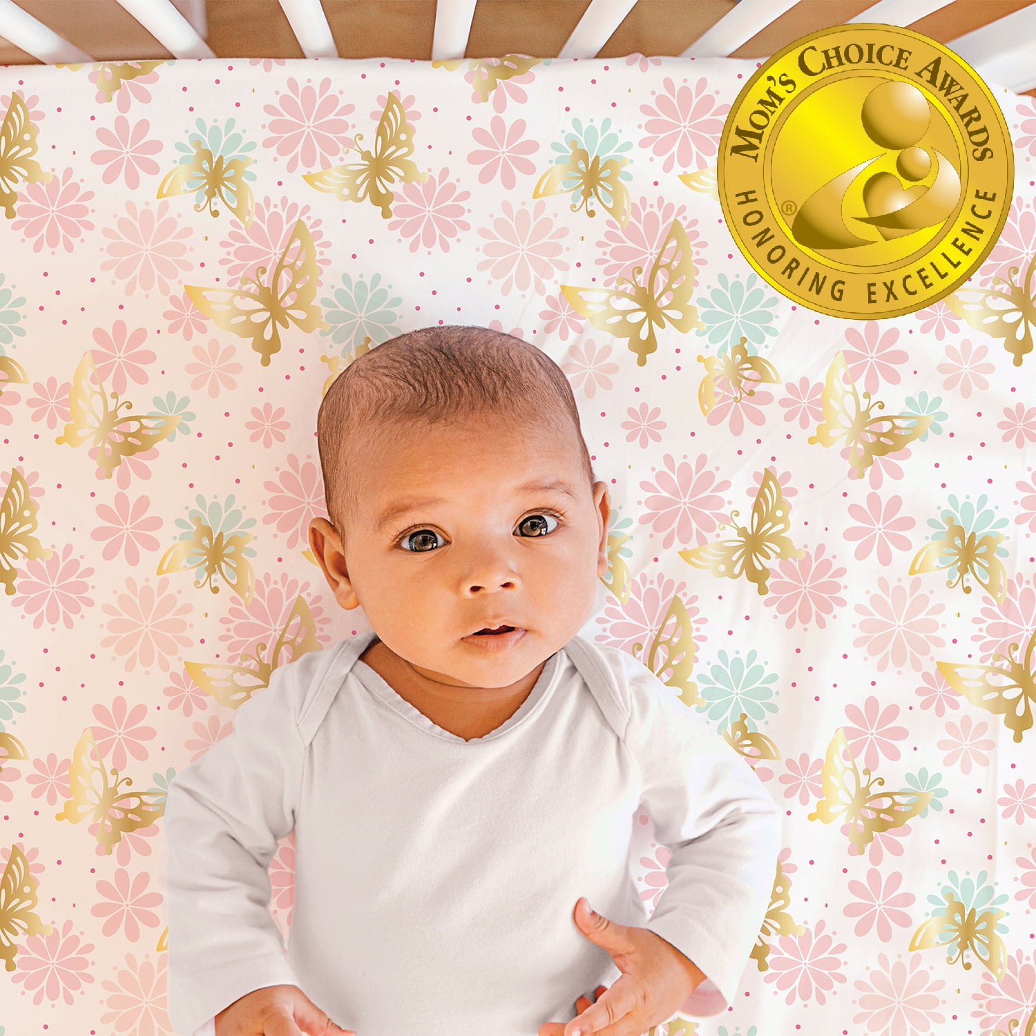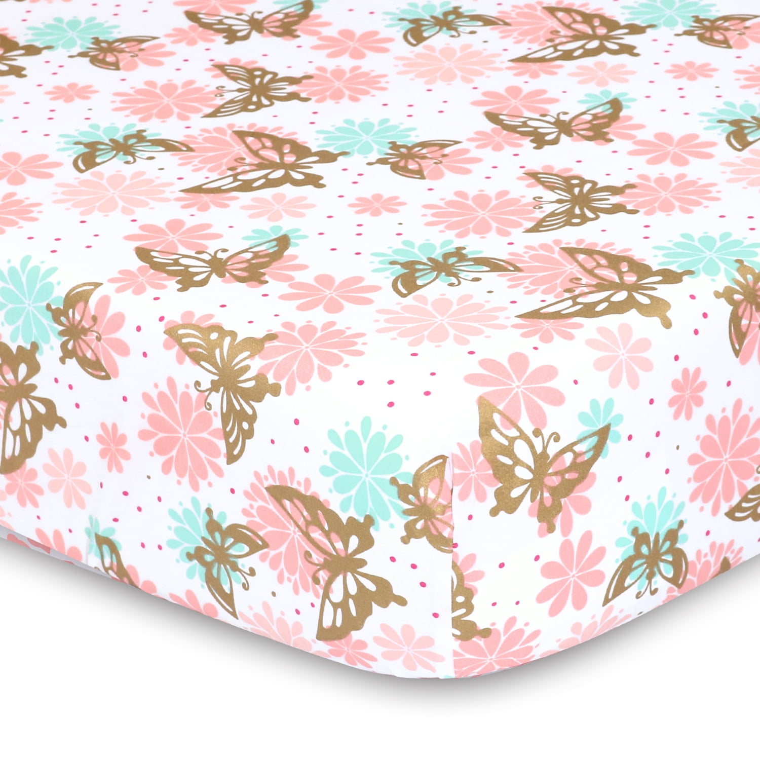 The magic of nature comes to life in The Peanut shell Pink and Gold Butterfly/Pink Floral 2 Pack Fitted Crib Sheet Set features flowers and butterflies in shades of pink and aqua dance together on a crisp white ground with shimmery gold accents on one sheet, while the other sheet features a sweet tossed floral print in the same shades. Microfiber fabric is touchable soft and the easiest of care; a pack of two allows for quick changes. Perfect for any baby girl’s room!