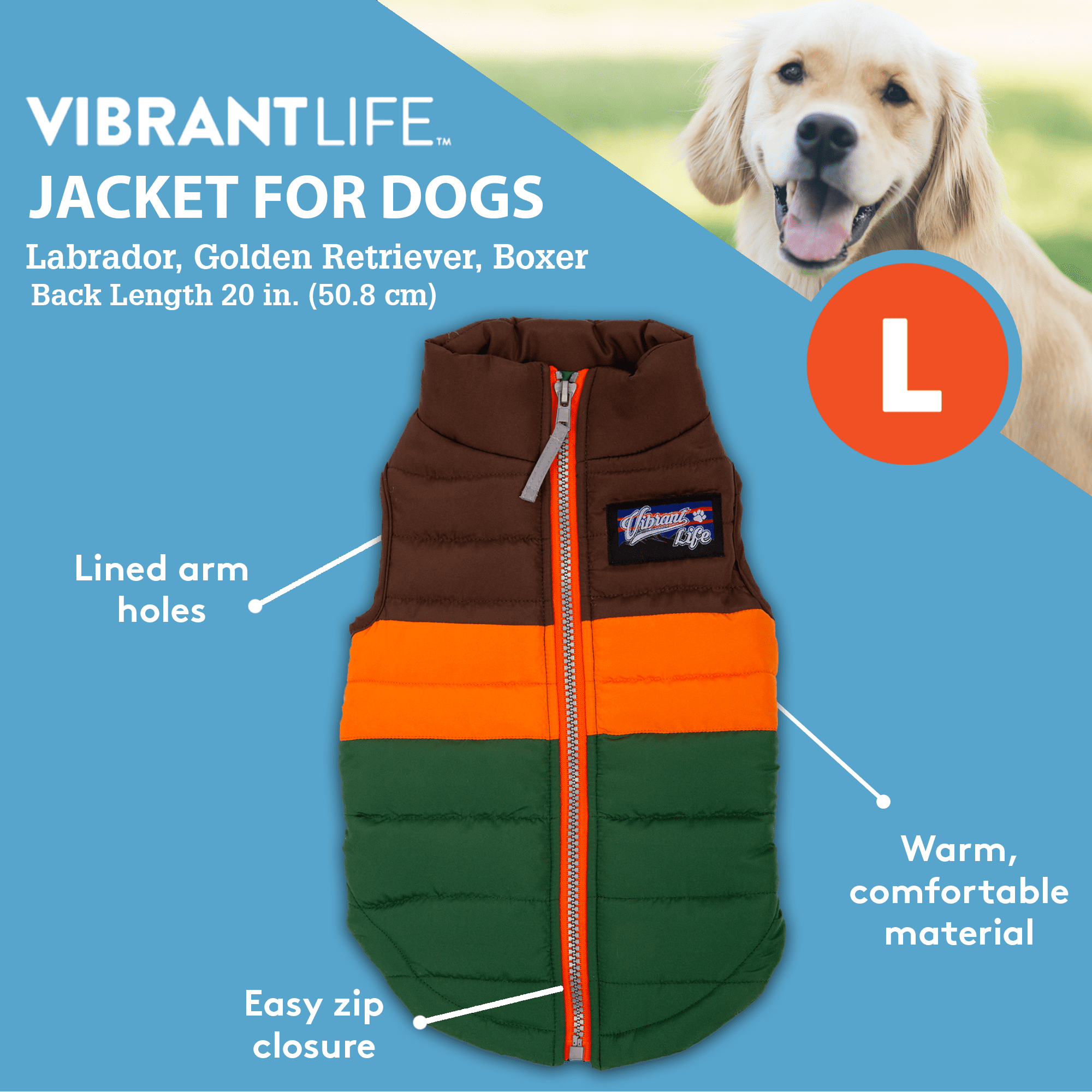 - MULTI-COLORED TRI-TONE JACKET: Size Large. From Vibrant Life. Channel a completely modern yet totally retro vibe with this tri-color zip-up bomber jacket designed specifically with your furry friend in mind. They’ll look cool in cooler temps wearing this human-inspired design
