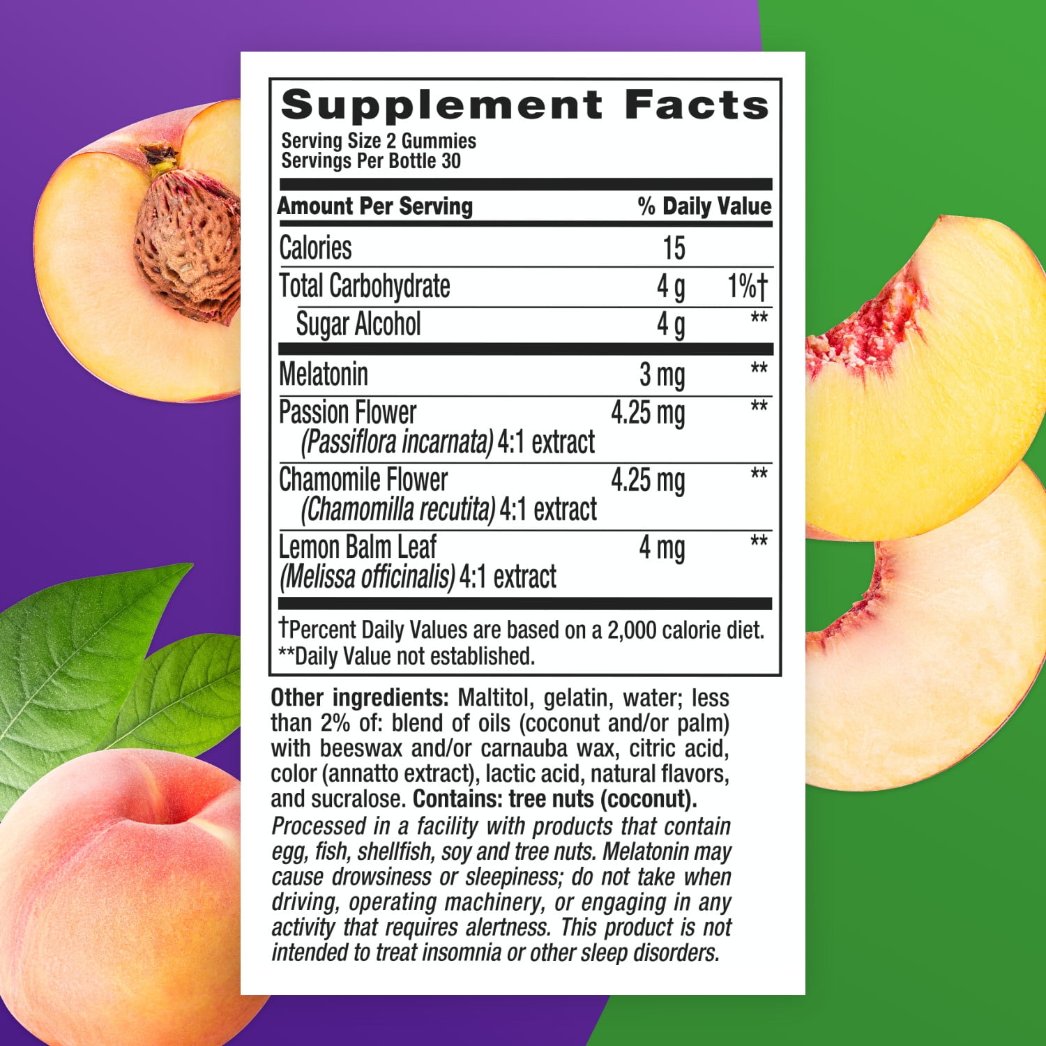 One serving of vitafusion Sleep Well Melatonin Gummy Supplements has 3 mg of melatonin to support sleep, maintain rest management, help with jet lag recovery, and support sleep cycle regulation. 1 This delicious sugar-free melatonin 3 mg gummy combines natural white tea and peach flavors for a tasty, sleep-supporting alternative to hard-to-swallow pills. 1 And if you’re looking for nightly sleep-aid gummies with a dose of melatonin, these sleep vitamins from vitafusion could be just what you need to sleep well. At vitafusion, we believe taste and nutrition can be fused together to deliver the best vitamin experience, ensuring it’s an easy and delicious part of your day. For over 12 years, we’ve been helping people to live happy and healthy lives with our gummy vitamins and supplements. Anything is possible when great nutrition is your foundation. Take a fruitful step toward a healthier, happier world with America’s #1 gummy vitamin brand. Vitamin Better! Look for our wide selection of melatonin gummies, including melatonin gummies for kids. 1 These statements have not been evaluated by the Food and Drug Administration. This product is not intended to diagnose, treat, cure or prevent any disease.