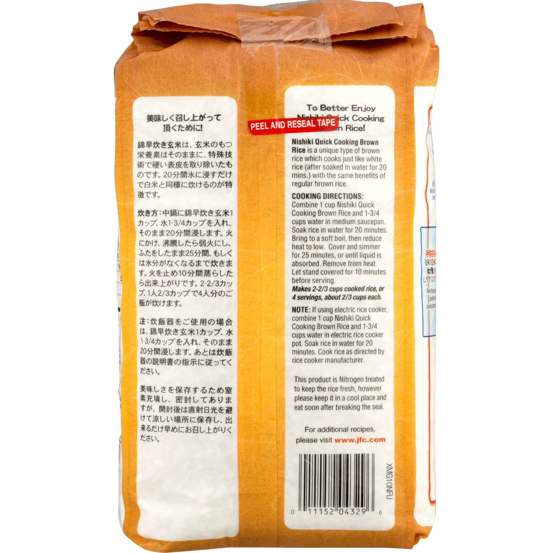 Quick Cooking, Whole Grain Brown Rice, Medium Grain, Bag 5 LB Quick cooking. Medium grain rice specially selected. For additional recipes, please visit www.jfc.com. Quick Cooking Brown Rice: Rice Bran layers are partially milled to quickly absorb water. Product of USA. Combine 1 cup Nishiki Quick Cooking Brown Rice and 1-1/2 cups water in medium saucepan. Bring to a soft boil. Reduce heat to low; cover and simmer 25 minutes, or until liquid is absorbed. Remove from heat. Let stand covered 10 minutes before serving. Makes 2-1/2 cups cooked rice, or 4 servings, about 2/3 cups each. Note: If using electric rice cooker, combine 1 cup Nishiki Quick Cooking Brown Rice and 1-1/2 cups water in electric rice cooker pot. Let stand 20 minutes. Cook rice as directed by rice cooker manufacturer. When cooking is complete, let rice stand 10 minutes before serving. Makes 2-1/2 cups cooked rice. 5 lb (2.27 kg) Los Angeles, CA 90040