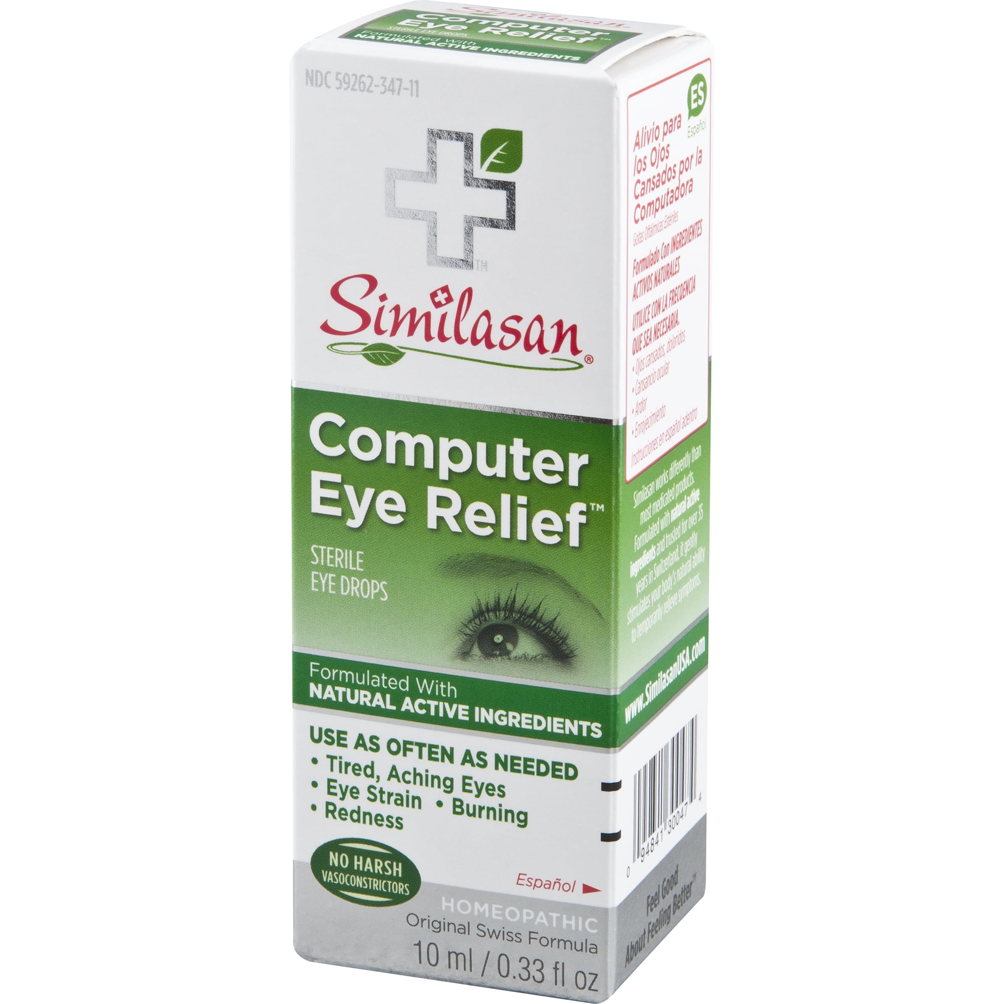 - Similasan Computer Eye Relief drops provide temporary relief from eye strain symptoms like tiredness, aching, burning, and redness. Use as often as needed with no known side effects.