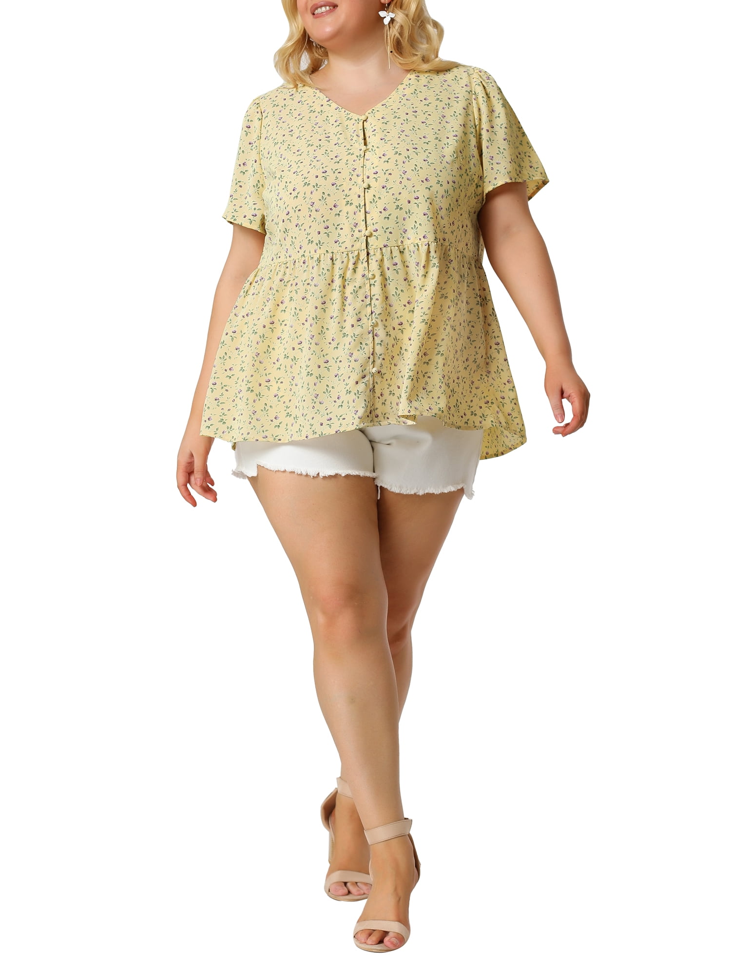 Agnes Orinda Juniors’ Plus Size V Neck Ruffle Hem Short Sleeve Cinched Waist Floral Peplum Top