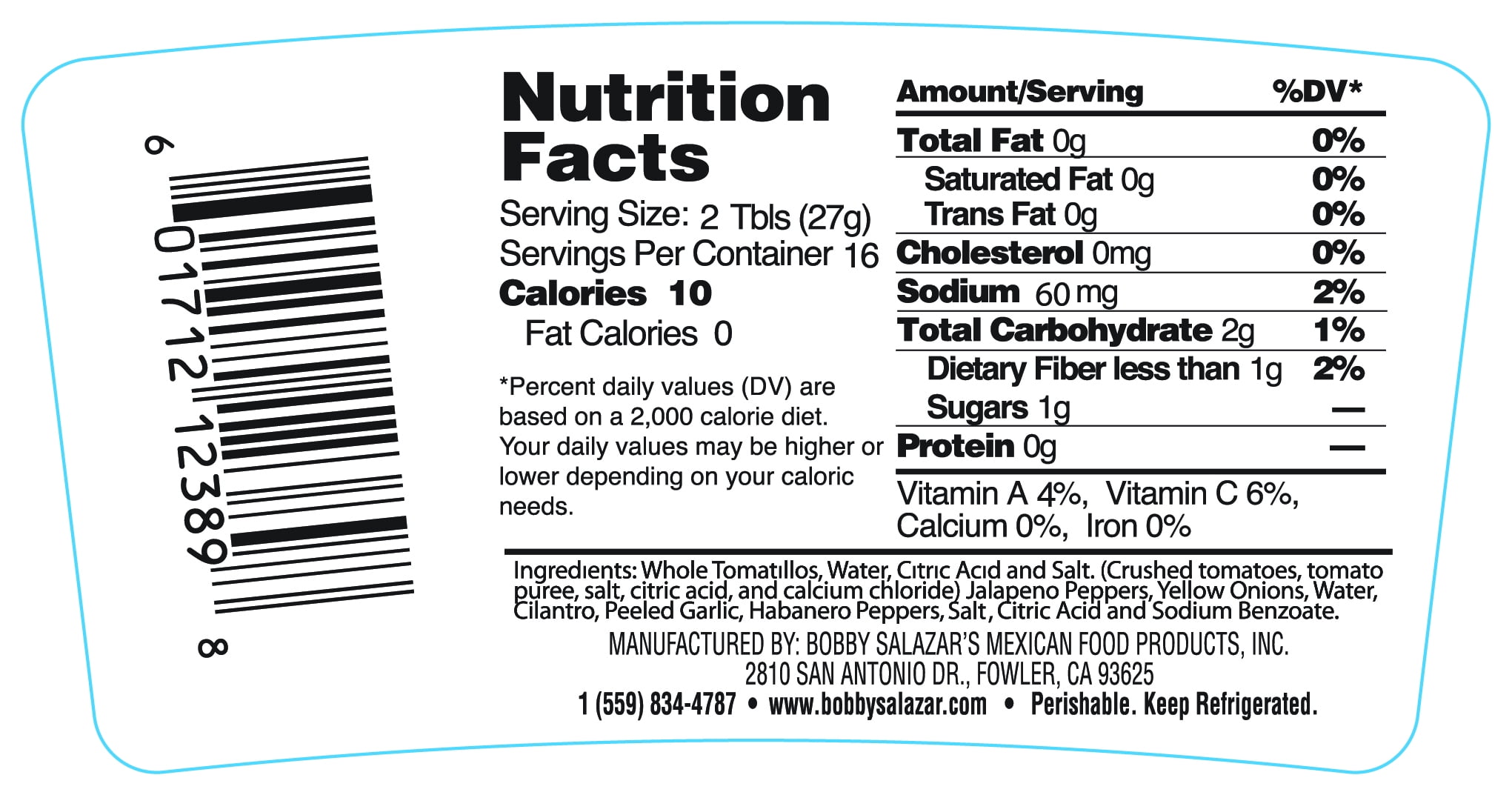 Salsa Verde, Hot 15 oz (425 g) Bobby Salazar’s authentic Hot green salsa is made with tomatillos and has the perfect amount of spiciness for those who like a little more heat . All of our salsas are made fresh daily using only the finest and freshest locally grown produce. Perishable item. Keep refrigerated. 15 oz (425 g) 2810 San Antonio Dr. Fowler, CA 93625 559-834-4787