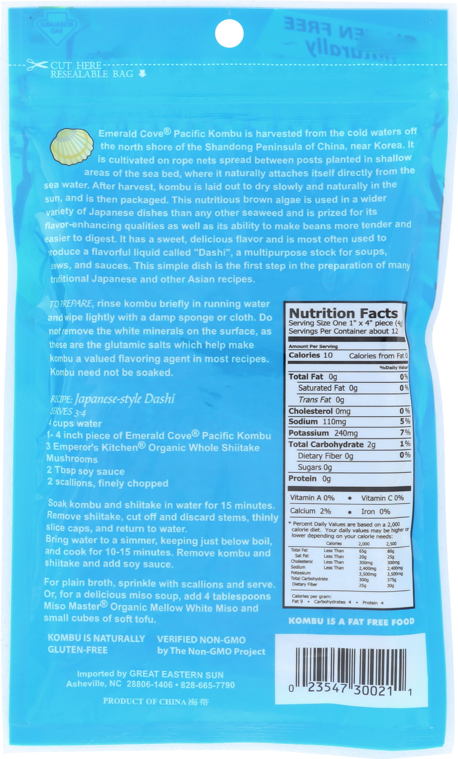 Emerald Cove Pacific Kombu is a delicious sea vegetable most commonly used to make Dashi (stock). Dashi is the base of many Japanese dishes and valued as a vital and richly flavored ingredient, and is indispensable to Japanese cuisine. Kombu is also used to soften beans and makes their protein more digestible