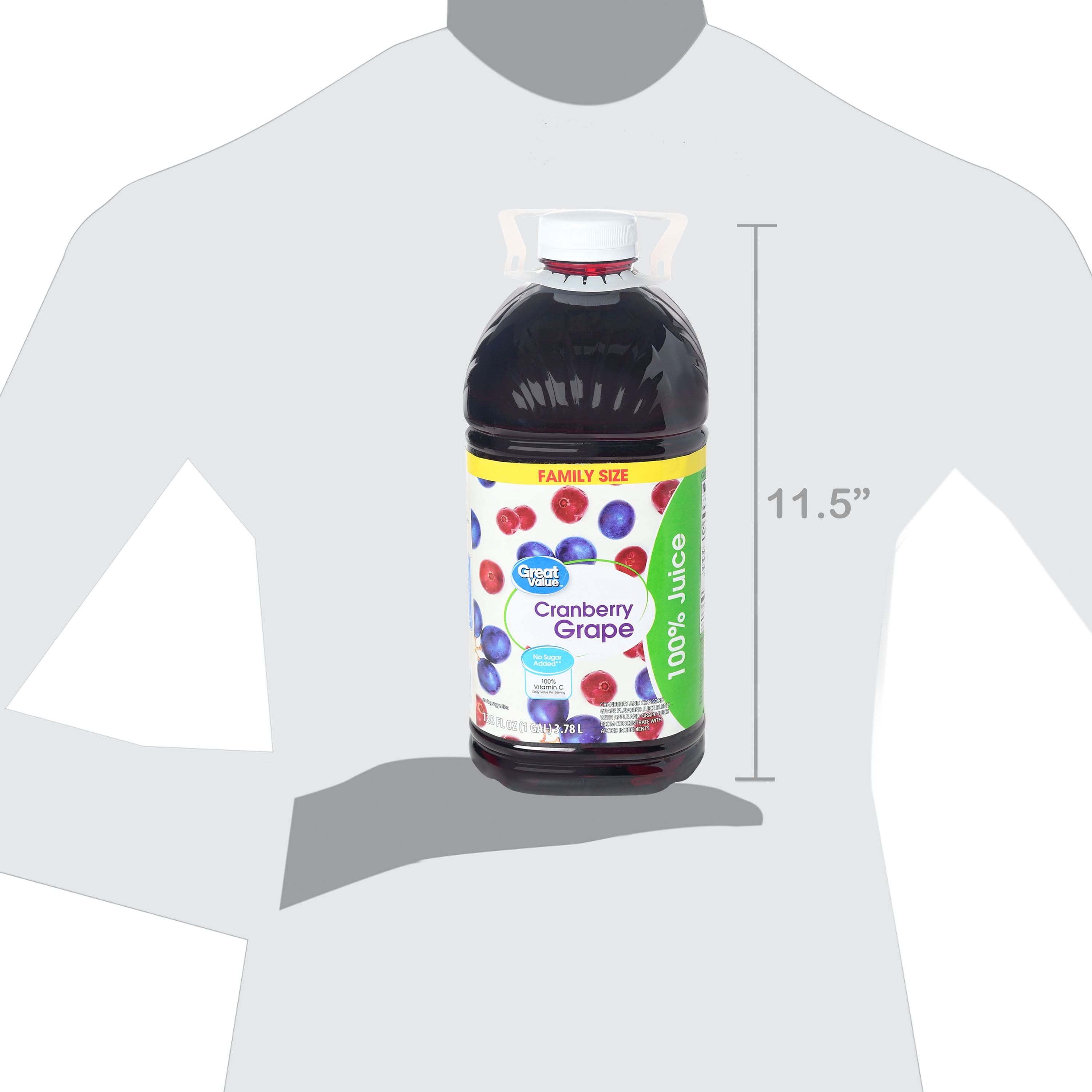 Satisfy your taste for a sweet beverage with Great Value Family Size Cranberry Grape Juice. This flavorful and refreshing combination of grape, cranberry, and apple juices comes in a large, 128-fluid ounce bottle, providing plenty for your whole family to enjoy. This juice blend is a perfect complement to any breakfast, and it can also make a sweet addition to a smoothie. Bring it out for your next family picnic or cookout. For a bold mixture of tart and sweet flavor, choose Great Value Family Size Cranberry Grape Juice.