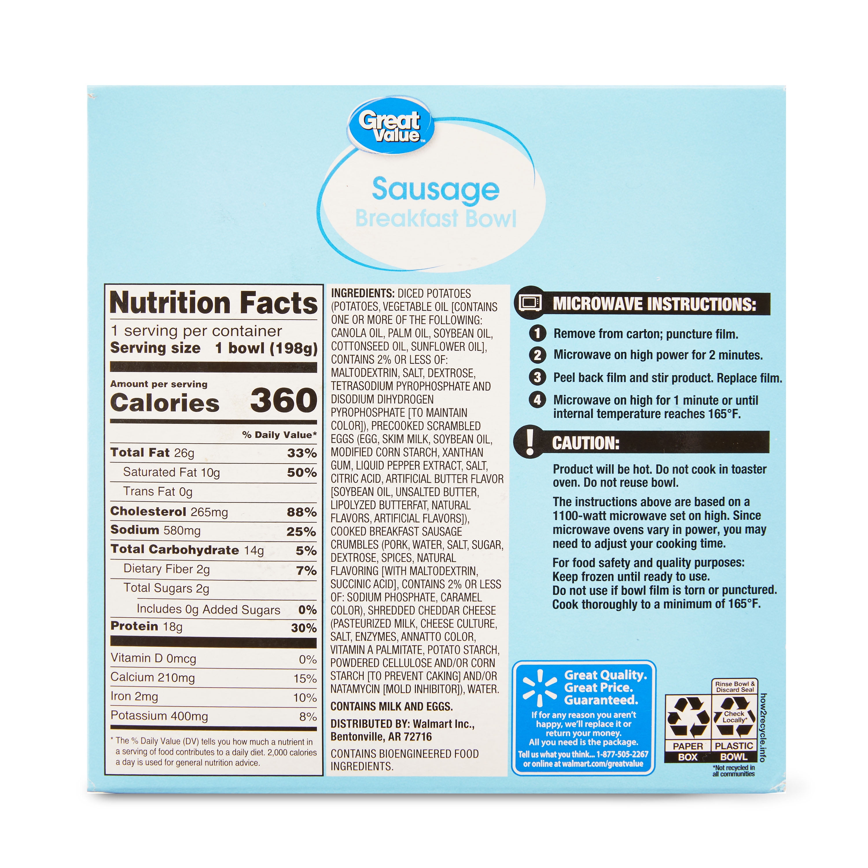 Kick start your day with Great Value Sausage Breakfast Bowl. This breakfast bowl is packed with 21 grams of protein and loaded with potatoes, eggs, cheese, and sausage crumbles to start your day off right. Great Value Sausage Breakfast Bowl is not only hearty and delicious but is quick and easy. Simply puncture the film on the top of the bowl and cook in the microwave for three and a half minutes and your breakfast is ready to go! The convenient single serve bowl makes your morning routine a breeze. Take home the Great Value Sausage Breakfast Bowl to spice up your morning today!