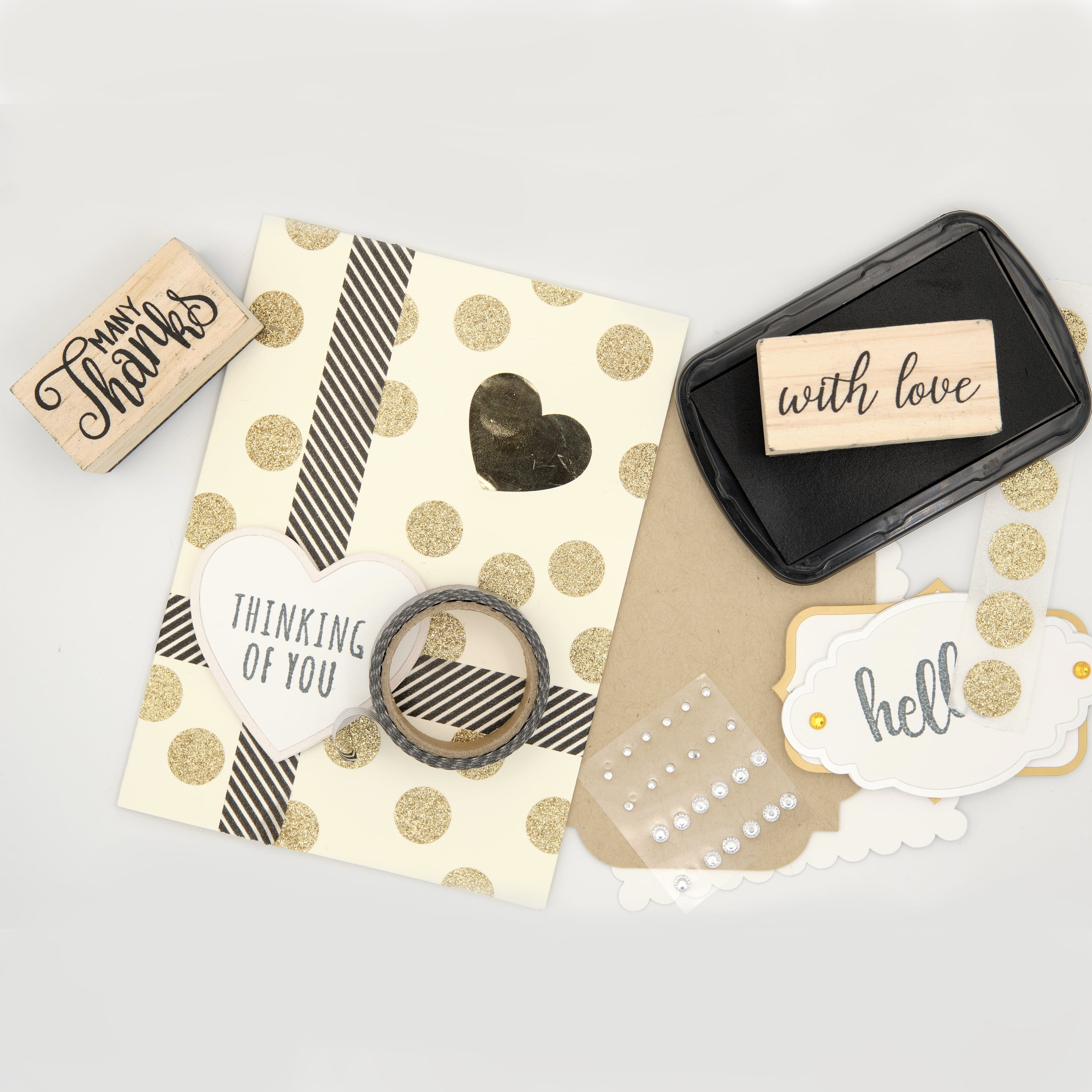- Includes 12 cards & envelopes, 200 glitter sticker dots, 12 sticker seals, 6 wood stamps, 1 ink pad, 12 die cut shapes & 53 adhesive foam stickers