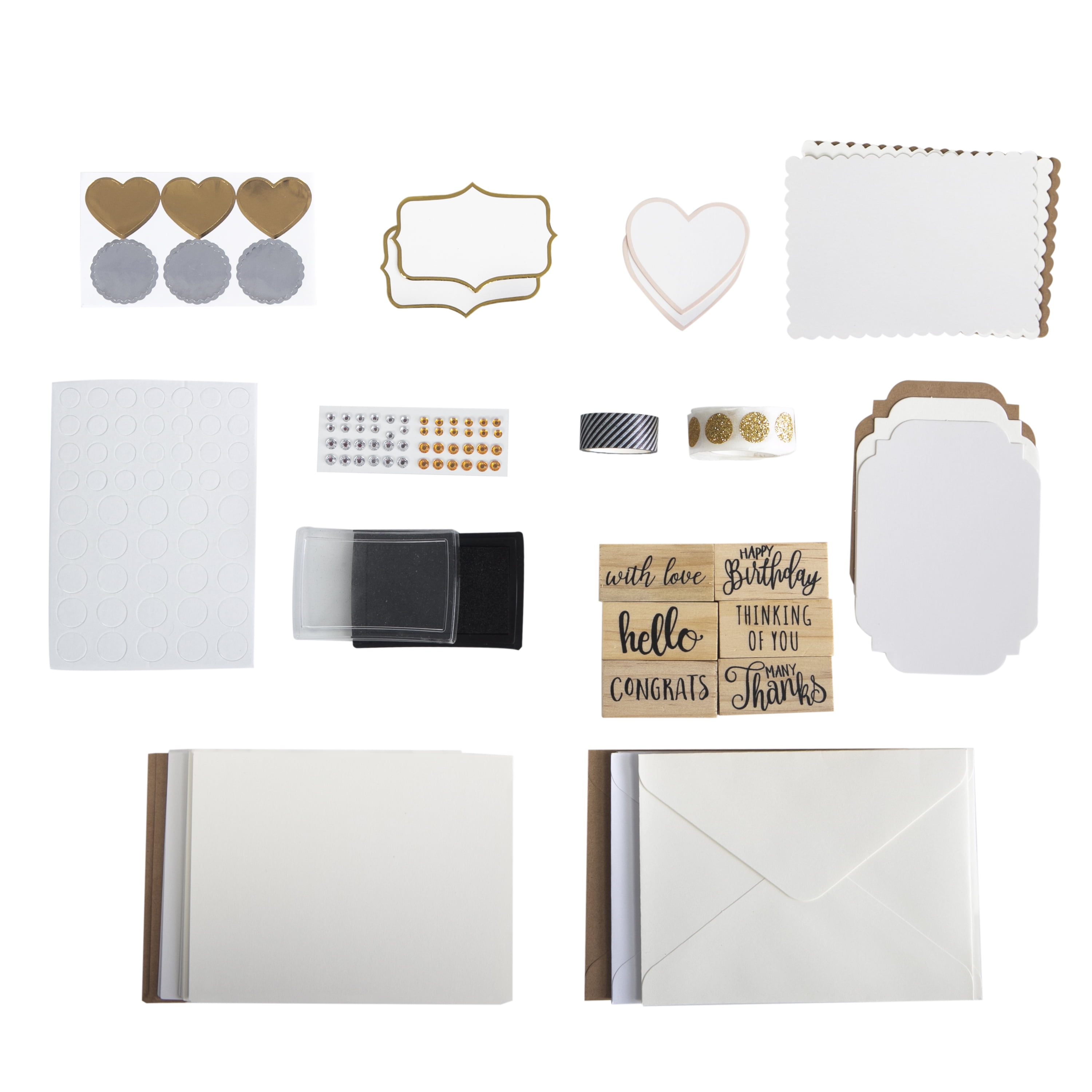 This Hello Hobby Notecard Making Stamp Kit contains everything you need to get started with cardmaking and to create cards for all occasions. You can create different kinds of cards, with embellishments, stamping and layers of shapes, and even add adhesive gems using all the items in the kit. Kit includes cards & envelopes, tons of stickers, 6 wood stamps with messages, an ink pad, die cut shapes and foam adhesive to layer them, along with a roll of washi tape. 357 pieces!