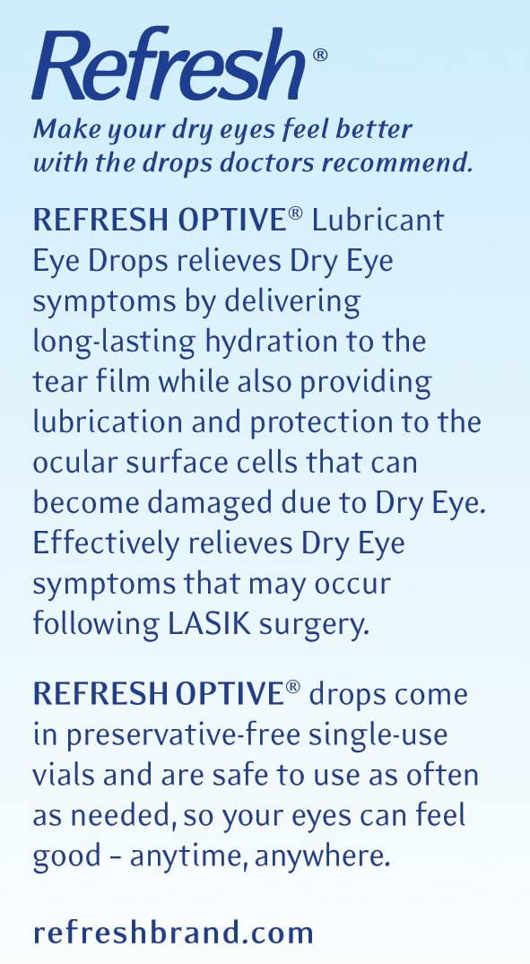 Refresh Optive Lubricant Eye Drops relieves dry eye symptoms by delivering long-lasting hydration to the tear film while also providing lubrication and protection to the ocular surface cells that can become damaged due to dry eye. Effectively relieves dry eye symptoms that may occur following Lasik surgery. Long-lasting hydration for dry eyes, including LASIK dryness: Refresh optive Preservative-Free Lubricant eye drops containing not just one, but two active ingredients that relieve dryness, burning, irritated eyes due to Dry Eye. This specially designed, the patented formula provides long-lasting moisture that hydrates and protects the cells of the eye that can become damaged due to Dry Eye. And, Refresh optive preservative-free is also recommended for LASIK dryness. If you have recently had LASIK surgery, please follow your eye doctor’s instructions regarding the use of Refresh optive Preservative-Free. Refresh optive Preservative-Free Lubricant Eye Drops come in sterile, single-use vials you can take with you anywhere. Safe to use as often as needed.