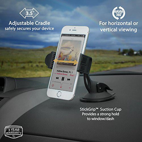 - SECURE: StickGrip Suction Cup base safely secures your mobile device to your vehicles dash, window or any flat, textured surface in your home or office.