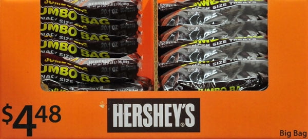 Treats, Milk Chocolate, Snack Size 20.1 oz (1 lb 4.1 oz) 569 g Jumbo bag. Manufactured on the same equipment that processes almonds. 20.1 oz (1 lb 4.1 oz) 569 g Hershey, PA 17033-8015 800-468-1714 The Hershey CompanyJumbo bagSnack size treatsKosher