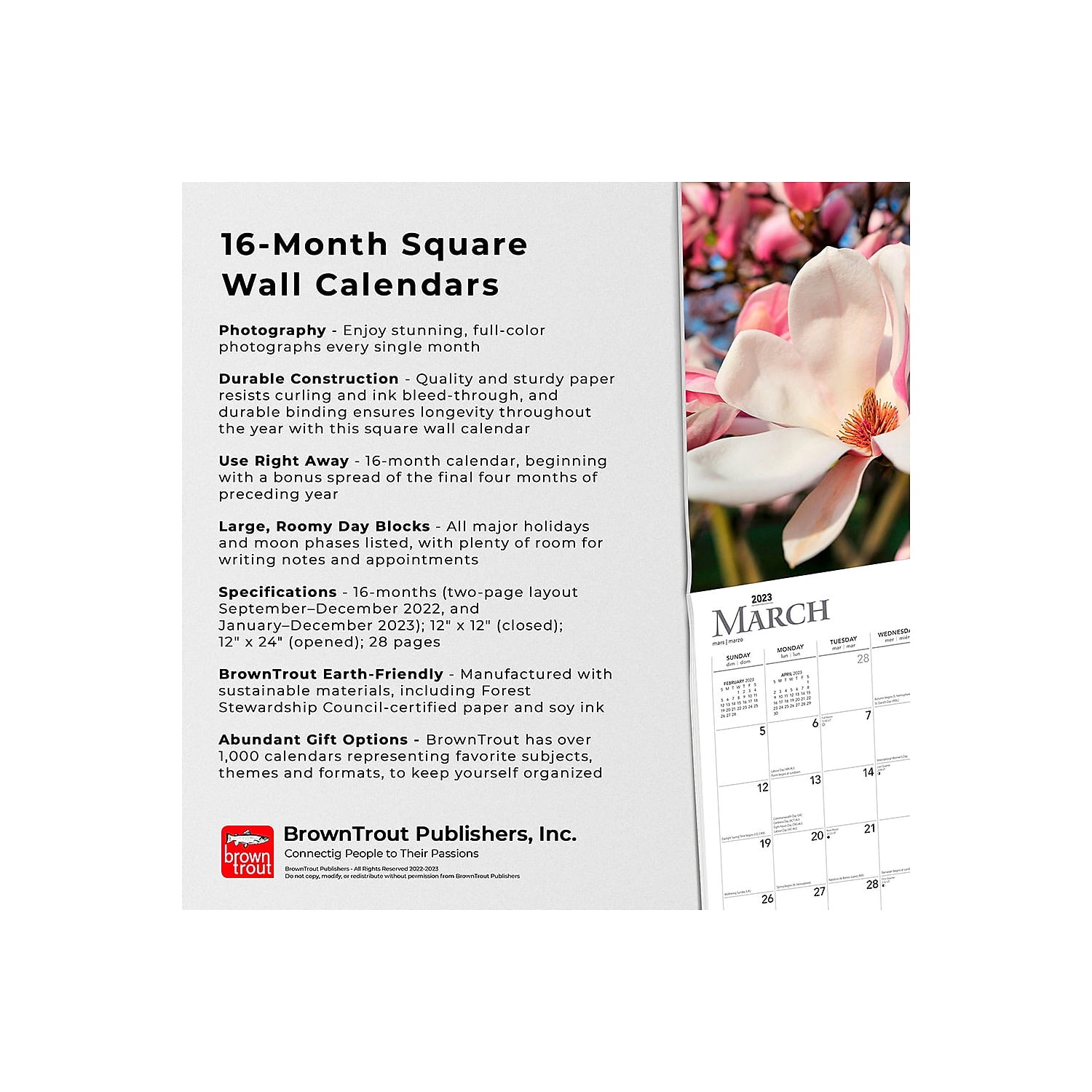 - Use Right Away – 16-month calendar, beginning with a bonus spread of the final four months of preceding year. Abundant Gift Options – Over 1,000 calendars representing favorite subjects, themes and formats, to keep yourself organized. Monthly. This product is manufactured by BrownTrout.