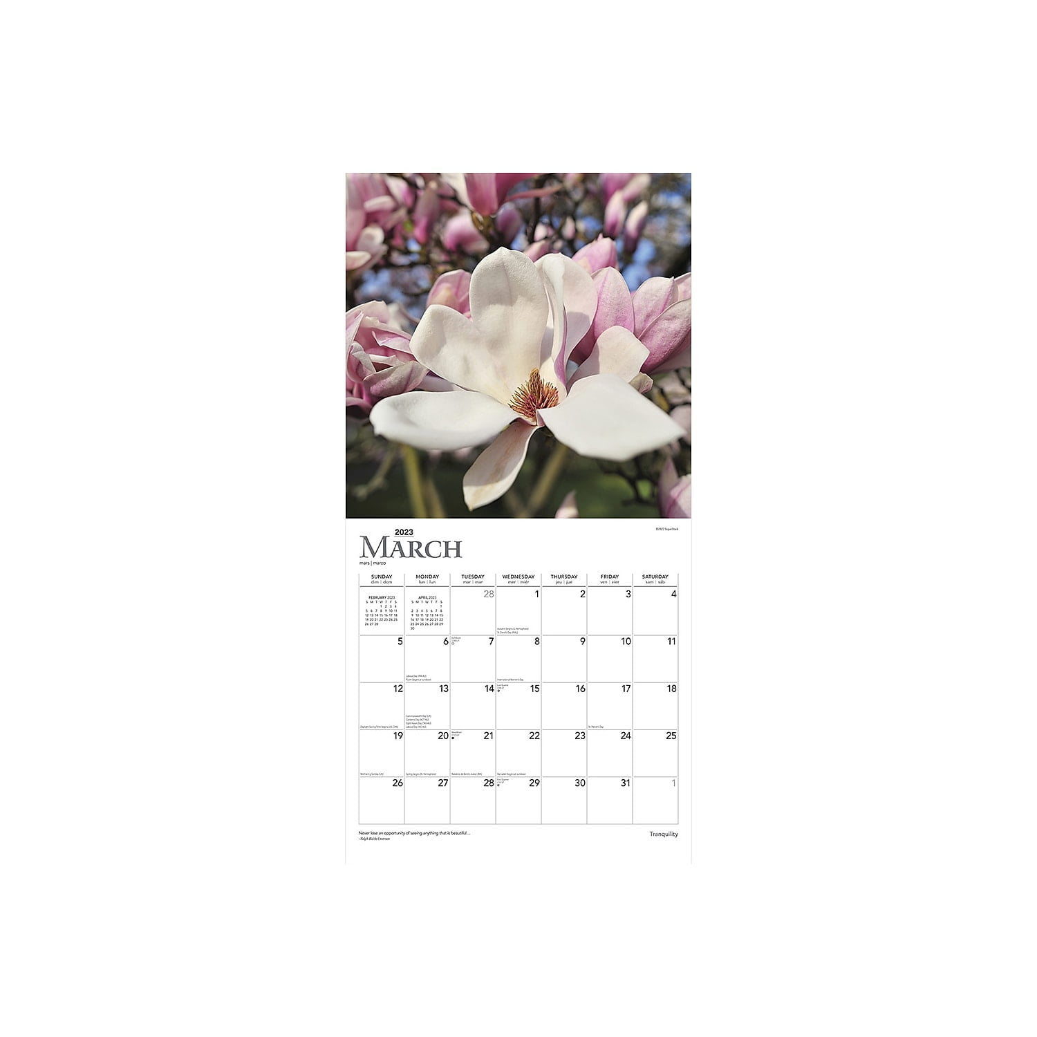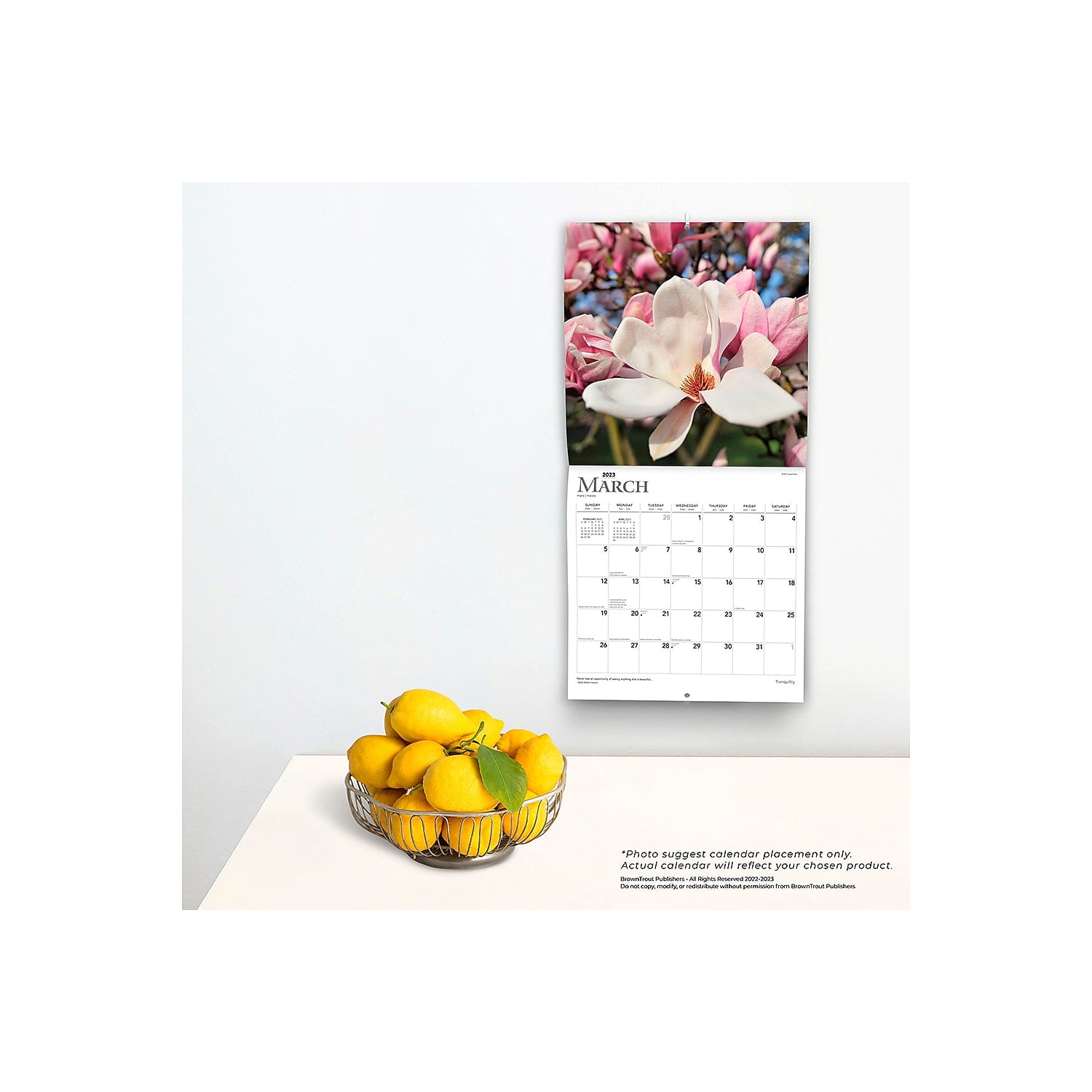Tranquility 2023 12 x 24 Inch Monthly Square Wall Calendar BrownTrout Inspiration QuotesOur fast-paced world often makes it difficult to find moments of calm. With 13 beautiful images, this Tranquility square wall calendar offers a picturesque walk through near and distant locales where quiet moments of self-reflection are abundant. Classic square format. Updated style. Our wall calendars include stunning images and even clearer grids and text. Filled with an abundance of holidays, each month’s grid is large enough for daily tasks and appointments. The largest publisher of affinity calendars and planners in the known universe. Photography – Enjoy stunning, full-color photographs every single month. Durable Construction – Quality and sturdy paper resists curling and ink bleed-through, and durable binding ensures longevity throughout the year. Use Right Away – 16-month calendar, beginning with a bonus spread of the final four months of preceding year. Large, Roomy Day Blocks – All major holidays and moon phases listed, with plenty of room for writing notes and appointments. Specifications – 16-months (two-page layout September–December 2022, and January–December 2023); 12"" x 12"" (closed); 12"" x 24"" (opened); 28 pages. Earth-Friendly – Manufactured with sustainable materials, including Forest Stewardship Council-certified paper and soy ink. Abundant Gift Options – Over 1,000 calendars representing favorite subjects, themes and formats, to keep yourself organized. 2023 Wall Calendar. Not a Dry Erase Calendar. 12"" x 12"". Monthly. January 2023 – December 2023. Tranquility. Recycled. This product is manufactured by BrownTrout. Sold as 1 Each.