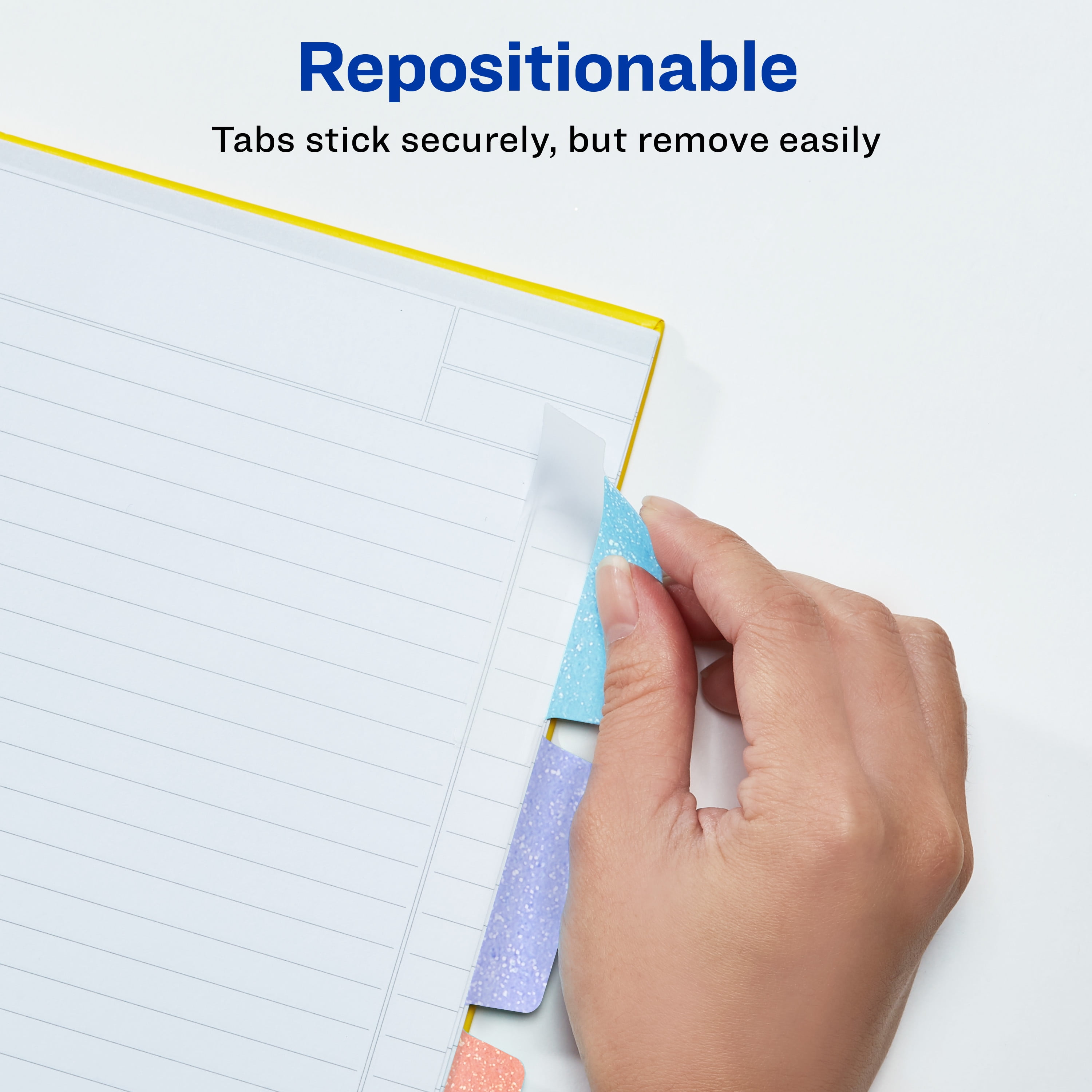 Give your planner, notebook, school and work supplies an upgrade with the Avery Ultra Tabs Luxe Collection with glittering pastel shimmer designs. The unique purple, green, blue and orange pastel materials are dappled with gold glitter to create a speckled effect that shines in attractive waves of light. Elegant and chic, the Luxe Collection provides a choice array of products that are certain to bring a premium touch to any kind of project. Every margin sticky tab features a sturdy 1.75" x .5" tab and a 2.5" x .5" adhesive body. The glittering design is applied on both sides of the tab for easier visibility from any angle. Both the clear body and the tab can be written on with permanent markers such as Marks-A-Lot markers as well as most pens, pencils and highlighters. The transparent tab body features a smudge-free surface for writing but drying time can vary depending on the ink used. The other side of the tab body uses a repositionable adhesive to make sure the tab stays put while also making them easy to peel to avoid damage to the applied surface and leftover residue. Paired with the sturdy tab material, the repositionable adhesive allows for easy reusability across multiple projects.