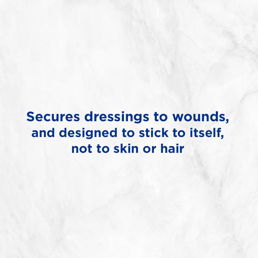 Band-Aid Brand of First Aid Products Hurt-Free Wrap firmly and comfortably secures dressings onto post-surgical wounds. This self-adherent wrap is specially designed to stick to itself without the need for pins, clips, or tape. Plus, it will not stick to skin or hair, for comfortable wound care that won’t hurt when removed. Ideal for post-surgery, this medical wound wrap provides durable coverage without leaving a sticky residue. The soft elastic material conforms to your body to move with you, making it ideal for hard-to-fit areas, like joints, while providing flexibility and cushioning on top of the wound. Caution: This product contains natural rubber latex which may cause allergic reactions.