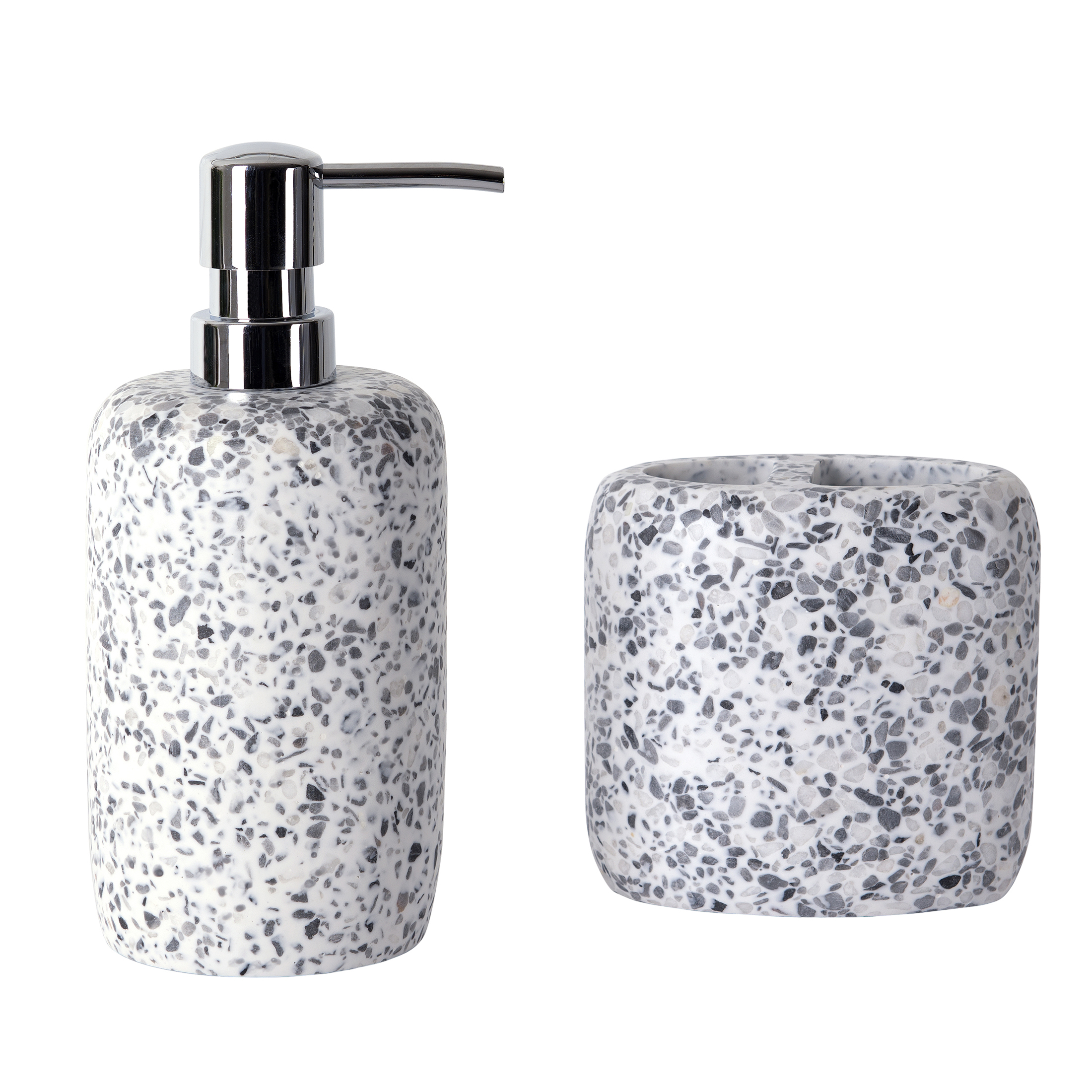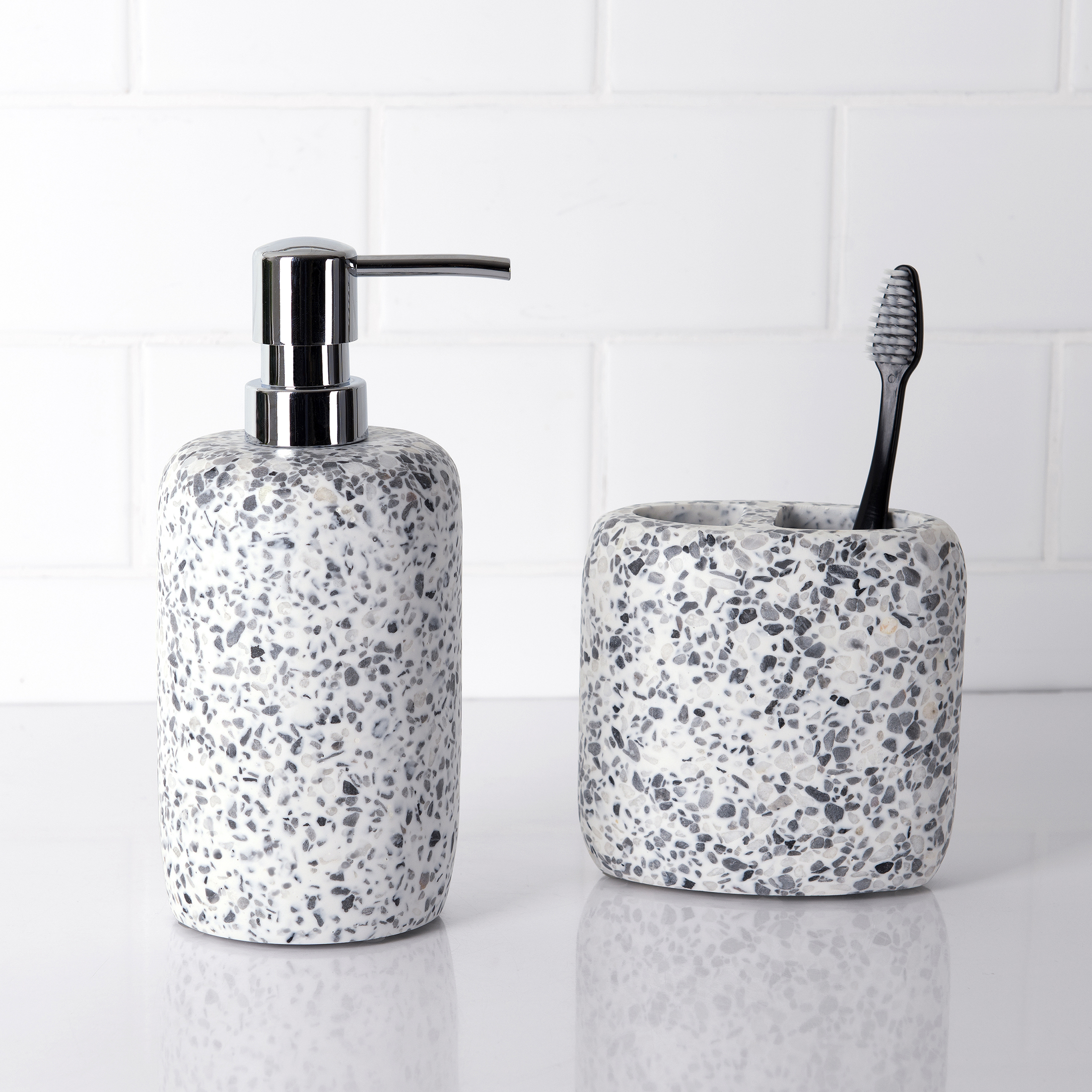 - Resin Toothbrush Holder mimics terrazzo flooring in a melange of grey stone tones adds visual appeal and texture to your contemporary bathroom