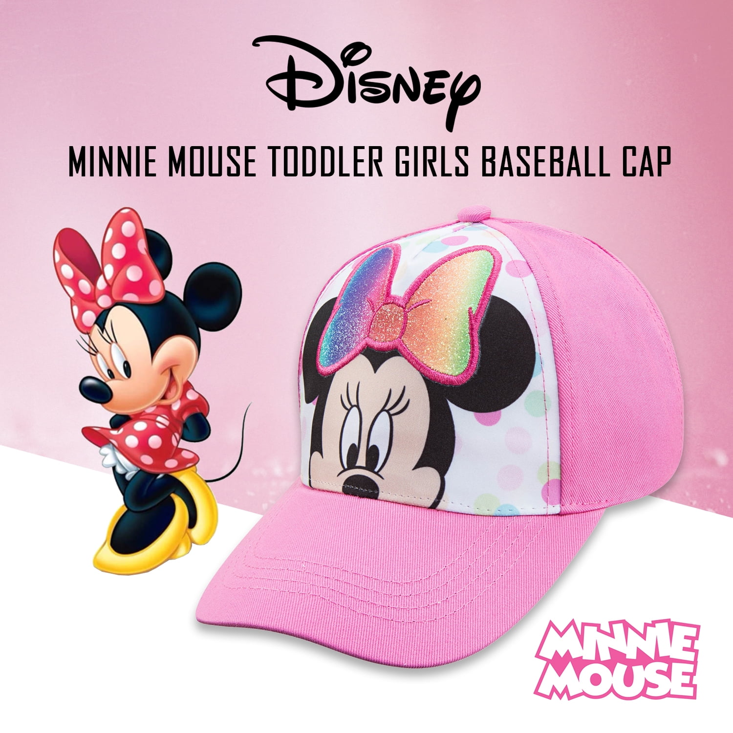 Disney Minnie Mouse Toddler Girls Pink Baseball Cap – Attached Rainbow Glitter Bow – Age 2-4