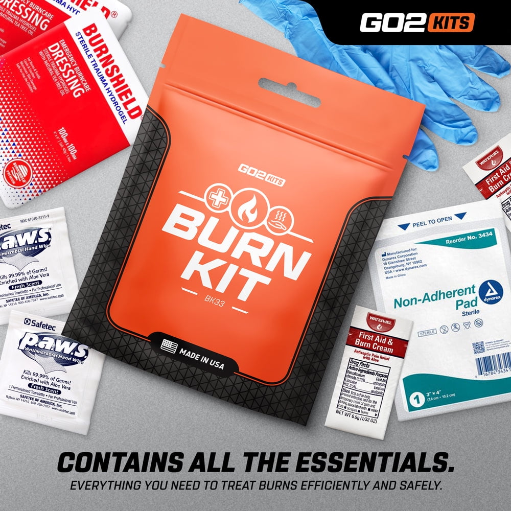 - CONTAINS ALL THE ESSENTIALS : 2 – 4” x 4” Burn Dressings, 2 Packets of Burn Cream (0.9g), 1-2” Roller Gauze, 1 Safe Bag and Twist Tie, 2 Pads 3” x 4” Non-Stick, 1 Burn Instruction Sheet, 2 Cleansing Wipes and 1 Pair Nitrile Gloves.