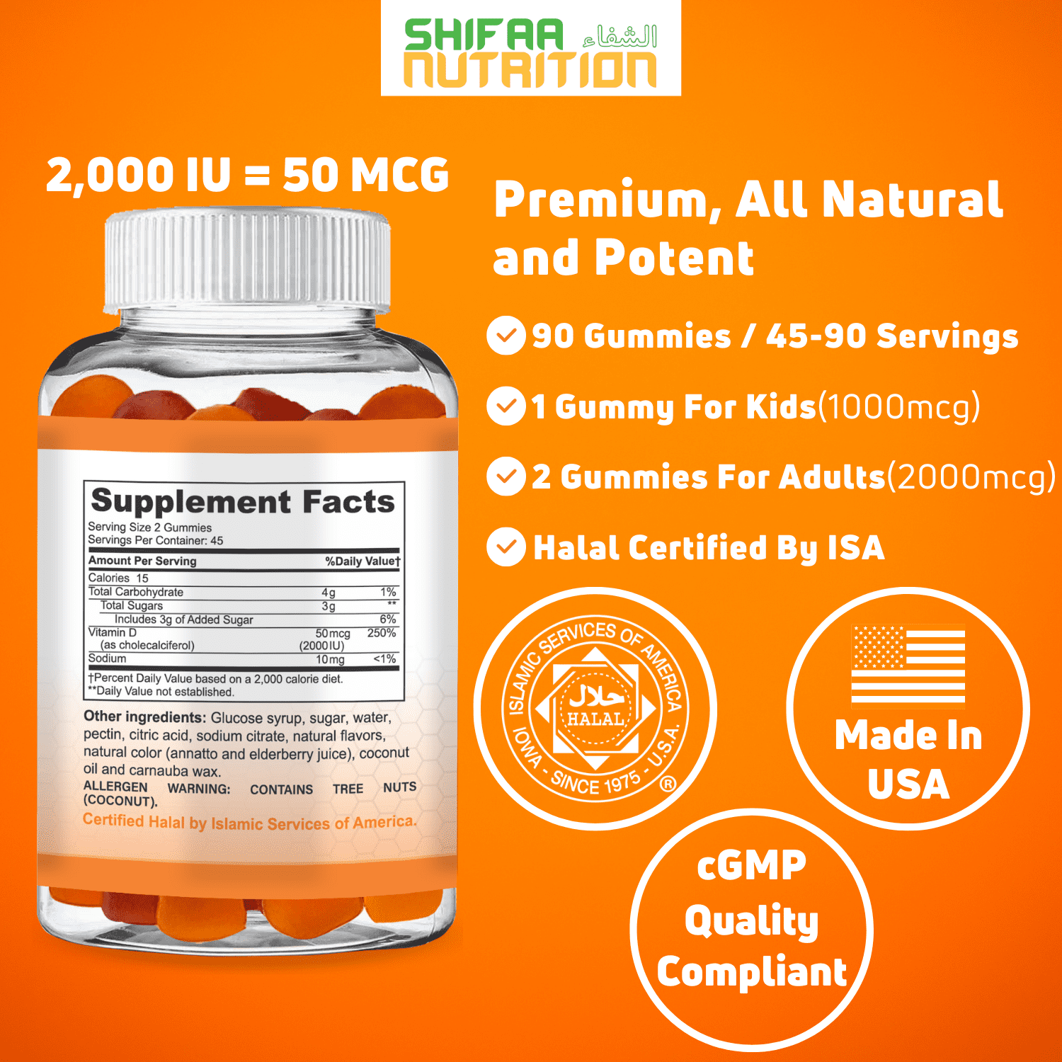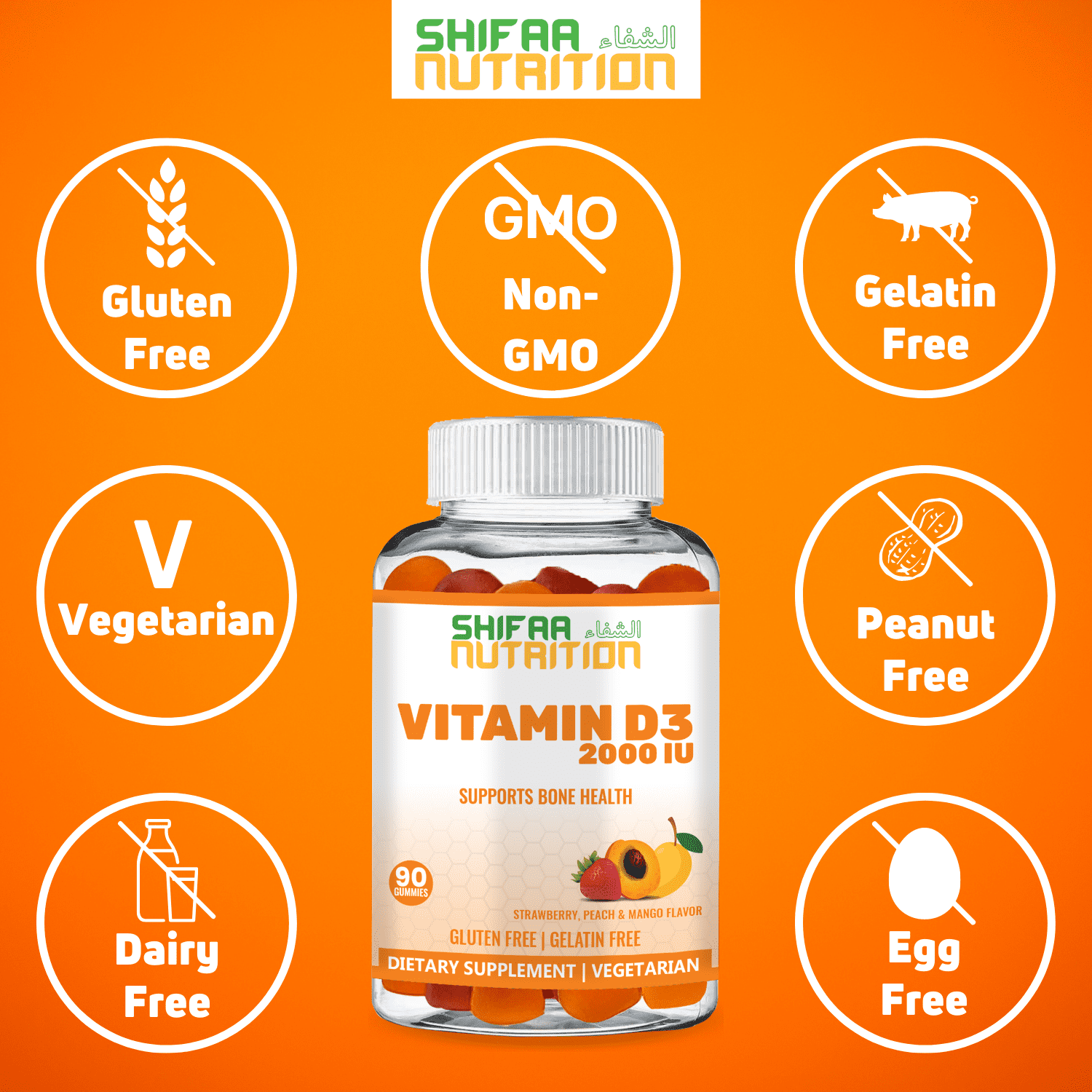 SHIFAA NUTRITION Vitamin D 3 gummies help Support Bone, Muscle, Immune Health and against Osteoporosis. The bottle contains three delicious, naturally derived flavors gummies including Strawberry, Peach, and Mango. The gummies are Halal and Vegetarian and contain no Gelatin. According to the National Osteoporosis Foundation, these gummies meet the recommended daily intake of Vitamin D3