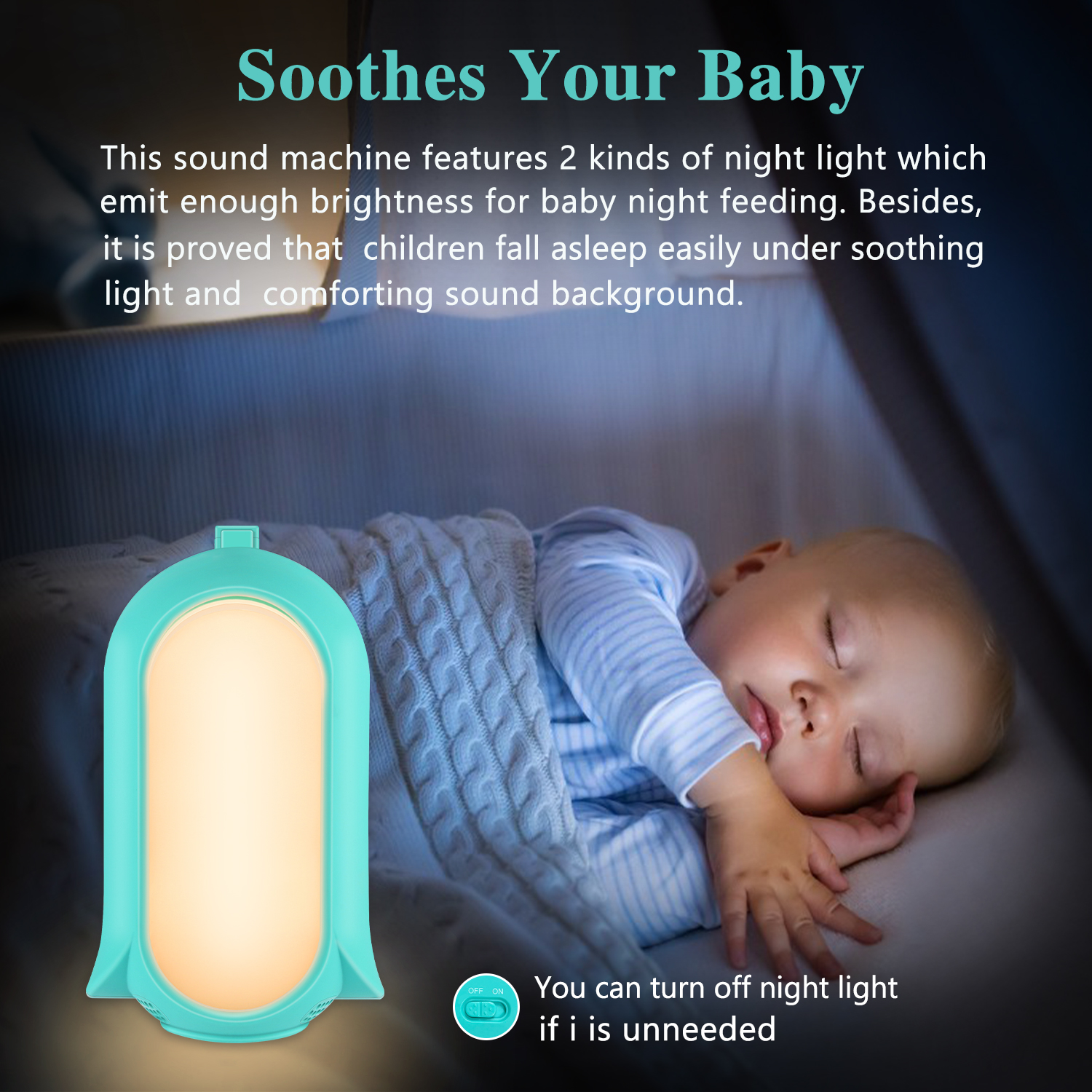 - 【UNIQUE SMART VOICE SENSOR FUNCTION】—The noise machine for baby will automatically sound and light when the outside voice reach 75dB. Even if baby wake up suddenly in the middle of the night, they will not cry or feel scared continuously before mom coming