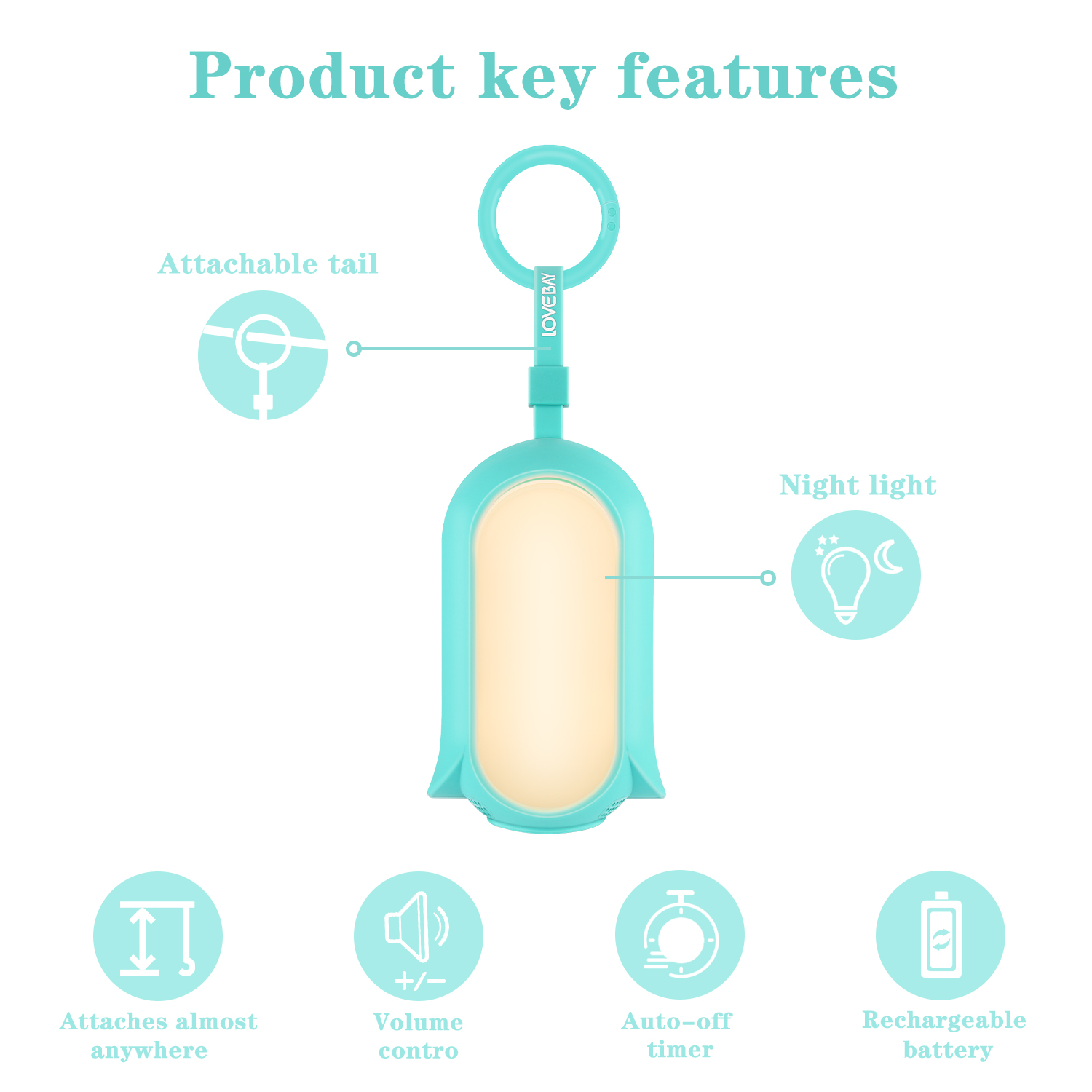 - 【WITH 7 SOOTHING NATURAL SOUNDS】—You can choose the sound you like from the 7 nature soothing sounds by clicking the sound button, lullaby, white noise, stream, ocean, rain, shush, cat purr, and then set the precise volume from 10 levels