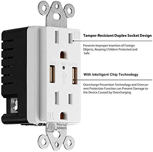 Description[Smart Design] Charge two USB powered devices simultaneously while also using two receptacles with our J&D USB Power Outlet. Save space and get a clean, uncluttered look. Come with 2 packs[High Speed] Supply a total of 4.2 Amp to USB ports, helping maximum and optimize the charging power of devices for fast and safe charging without overcharging[Wide Compatibility] Compatible with most USB devices, including iPad and other tablets, e-readers, digital cameras, smartphones like iPhone X, iPhone 8 / 8 Plus, Samsung Galaxy, and a variety of other devices USB powered electronics for wide-raging use[Tamper-Resistant] ETL / cETL498 Listed (cETLus approved). FCC approved. Meeting the requirement of 2017 NEC 406.12, receptacles are tamper-resistant that can prevent improper insertion of foreign objects, keeping children protected and safe[J&D warranty] 1-month hassle free return and 12-month limited warranty (free replacement)