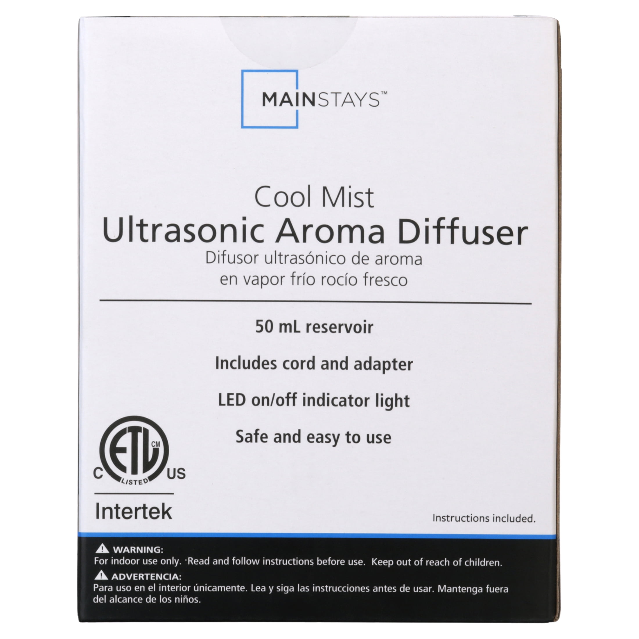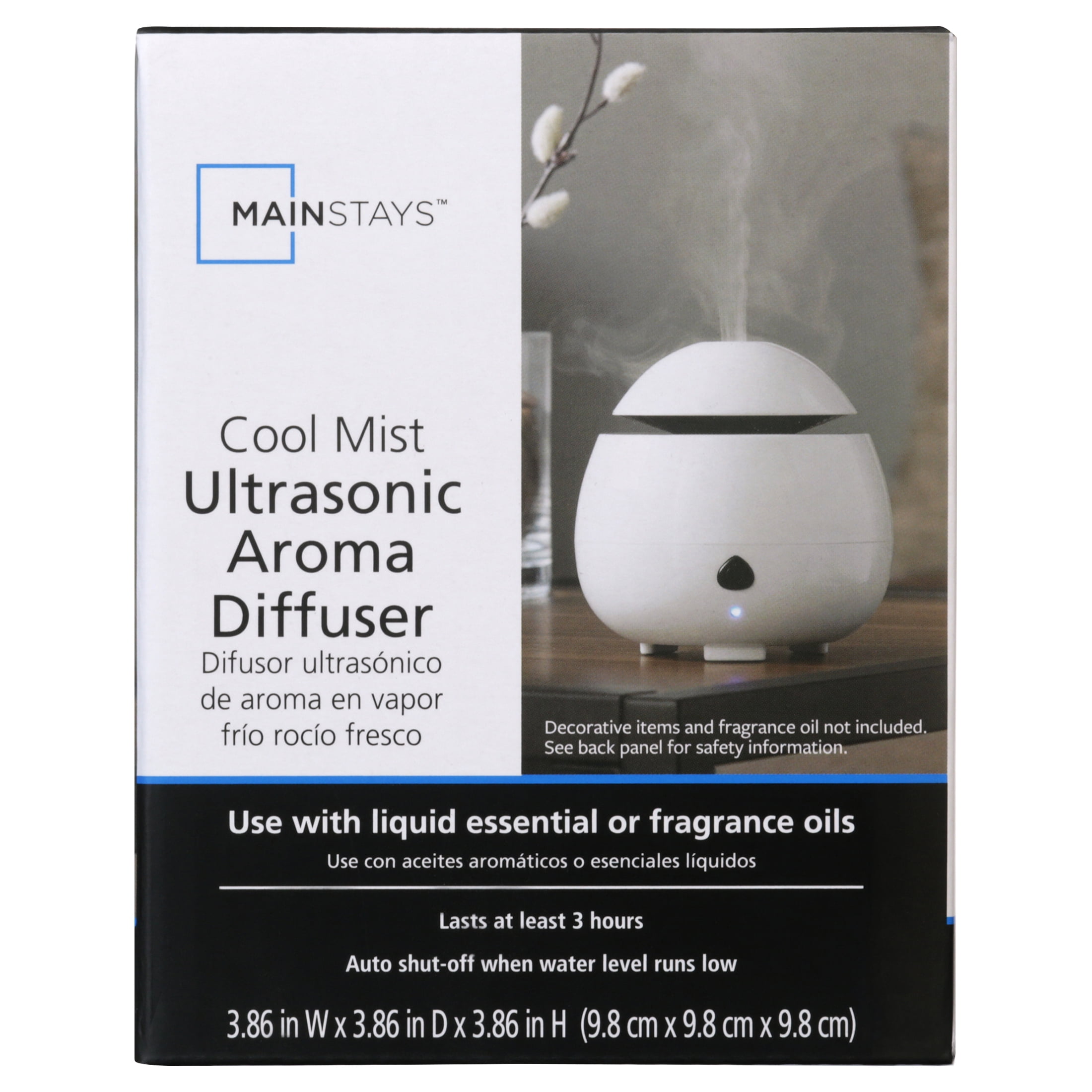The Mainstays 50 mL White Diffuser humidifies the air while enhancing your home or work environment with soothing aromatherapy. Cool mist diffusers humidify the air in your home by utilizing ultrasonic vibration to release a cool mist into the air. For safety, it automatically shuts off when the water reservoir is empty. This cool mist aroma diffuser has a 50 mL capacity which can last up to 3 hours. Combine your favorite essential oils to create custom blends. Perfect as a starter set for beginners, dorm rooms, traveling, and taking the benefits of essential oils everywhere you go. (Fragrance and essential oils are sold separately).