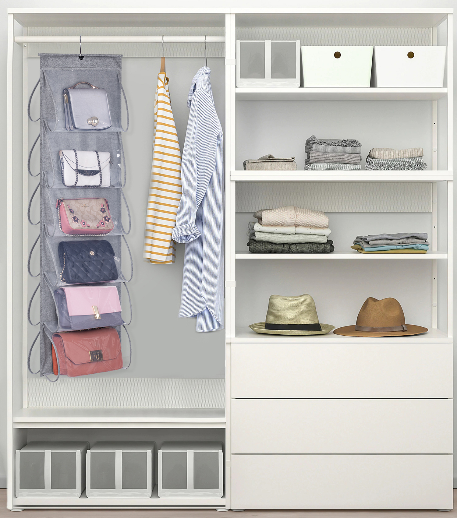- [Versatile Closet Organizer] Overall size measures 14" W X 44" H; Not only used for shoes organization, But also for handbag, scarf, purse, accessories, leggings storage in the closet rod, bedroom, laundry room, apartment, rv, dorm, etc.