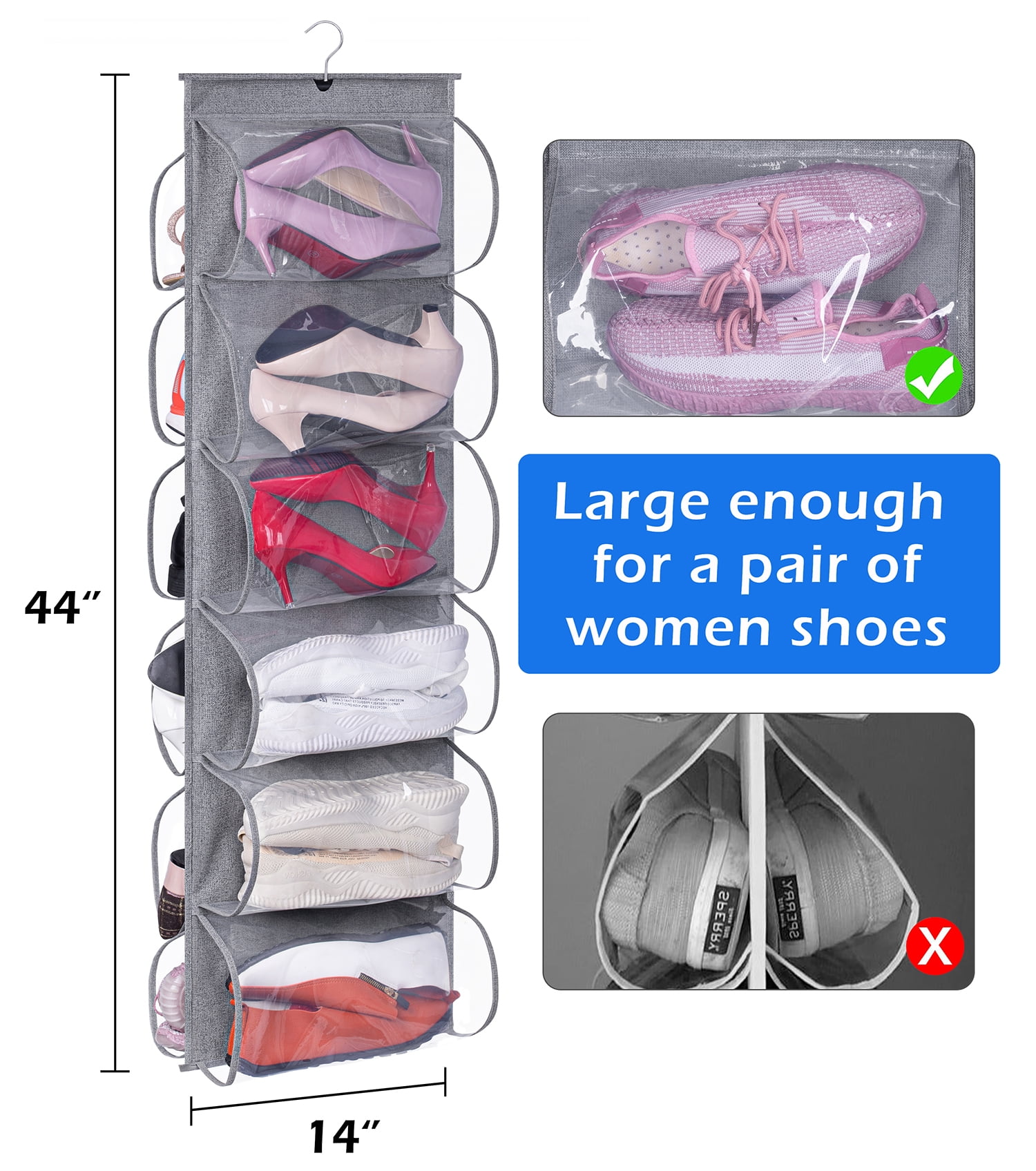 - [ Large Capacity ] Dual sided shoes organizer with total 12 large pockets. Easily suit for 12 pairs ladies size 8.5-9 high heels or 6 pairs size 14 men shoes or one handbag per slots