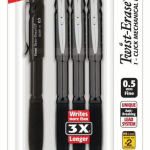 The Pentel Twist-Erase III features a comfortable, extra-soft latex-free grip for less writing fatigue. Available in 0.5 mm, 0.7 mm and 0.9 mm lead sizes; it is pre-loaded with Pentel Super Hi-polmer HB lead that never needs sharpening, is super strong and produces a clear dark line.