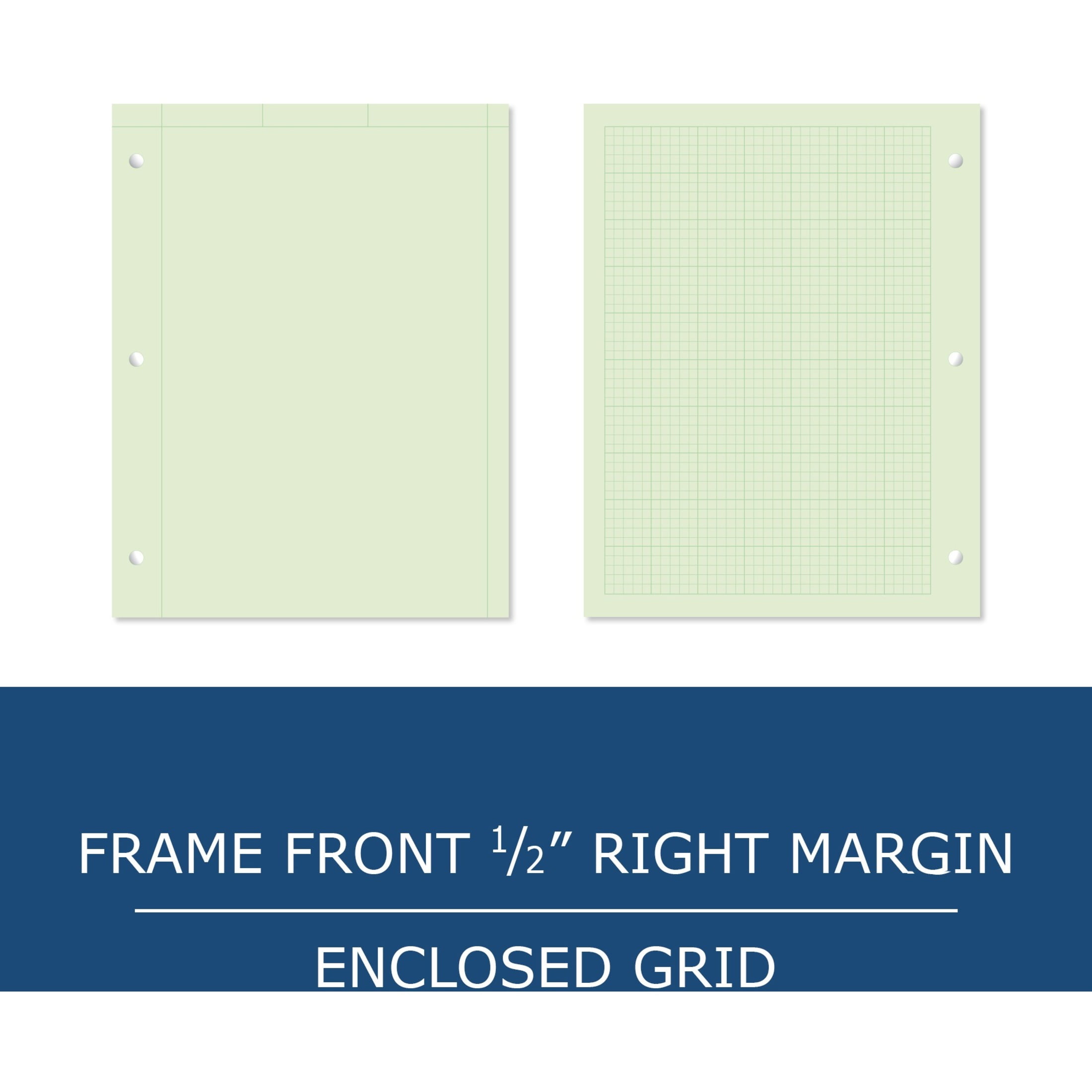 Excellent pad for usage in engineering classes and labs. Smooth, green 16# writing paper is plain, except for printed outline box on top of sheet, and has 5 square/inch grid layout printed on back of sheet. Back grid shows through to front as dimensional guide for drawings and layouts. 34 pt chipboard backs add stability. Glued along 8.5" (top) edge and 3-hole punched to fit in standard 3-ring binders. Sheet size is 8.5" x 11". 100 sheets per pad. Each pad is polywrapped.Smooth 16# Green Tint paper;5×5 printed grid back-shows through to front sheet;100 sheets, 8.5" x 11";Pad is glued along 8.5" edge;3-hole punched for use with standard ring binders