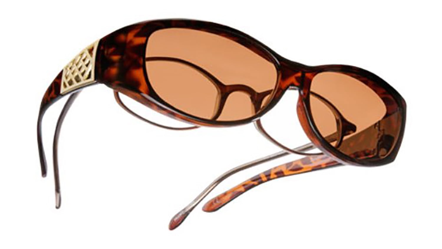 Foster Grant® Solar Shield® Fits Over sunglasses are designed to wear over your glasses or alone. The fashionable oval shape offers flash silver mirror lenses that provide 100% protection from harmful UVA-UVB rays. Their tortoise shell frames with gold basket weave accents provide a fashionable look. And of course, these polarized lenses offer scratch- and impact-resistance.