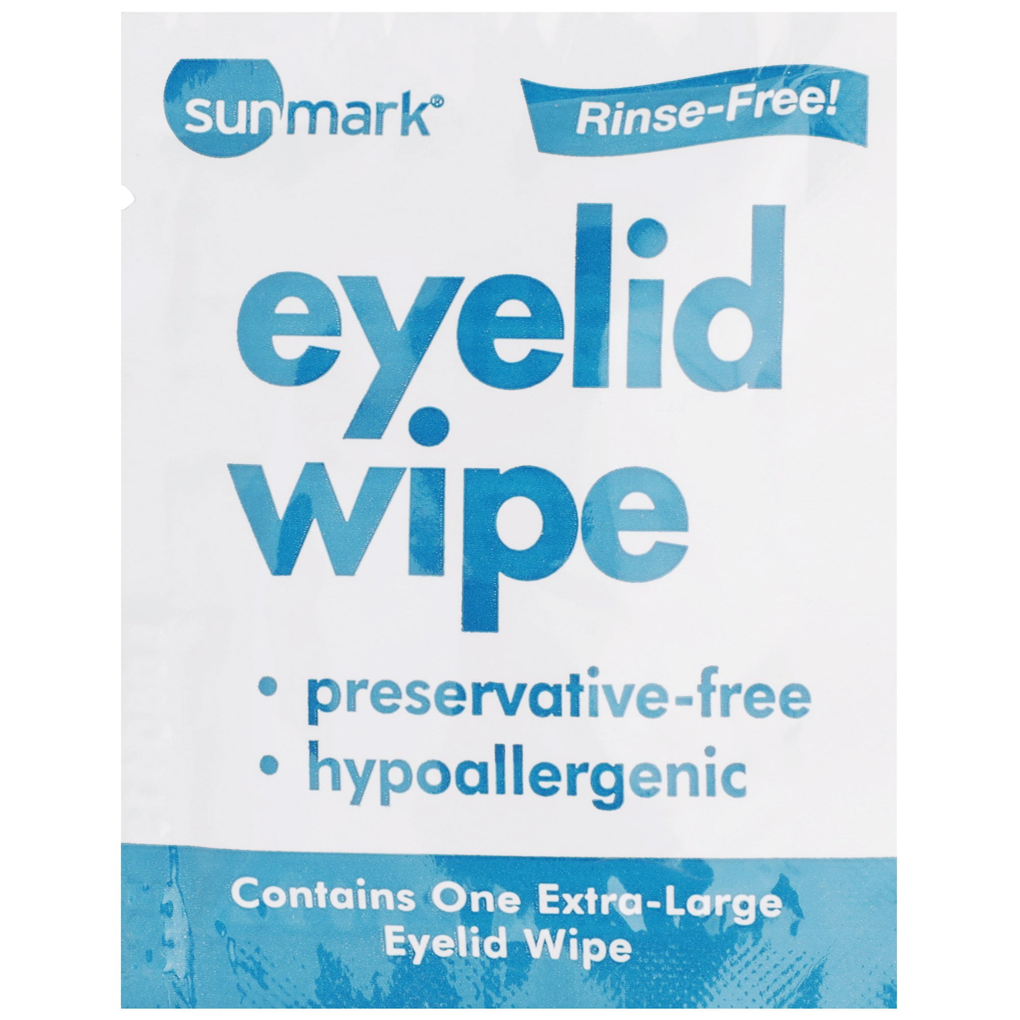 For adults and children. Sunmark rinse-free and preservative-free eyelid wipes offer an easy solution to cleansing the eyelid area when on the go. These tearless wipes are effective for removing debris and other secretions from the eyelid when needed. As an added option this wipe can also be used as makeup removal. Sunmark eyelid wipes are also larger to allow for a better clean by removing more debris from a single eyelid at one time. Hypoallergenic.For adults and children. Sunmark rinse-free and preservative-free eyelid wipes offer an easy solution to cleansing the eyelid area when on the go. These tearless wipes are effective for removing debris and other secretions from the eyelid when needed. As an added option this wipe can also be used as makeup removal. Sunmark eyelid wipes are also larger to allow for a better clean by removing more debris from a single eyelid at one time. Hypoallergenic.Ingredients: Water; Polysorbate 20; Disodium Phosphate; Lauryl Glucoside; Sodium Chloride; Sodium Phosphate; PVP; Disodium EDTA; Chamomila Recutita (Matricaria) Flower Extract; Glycerin