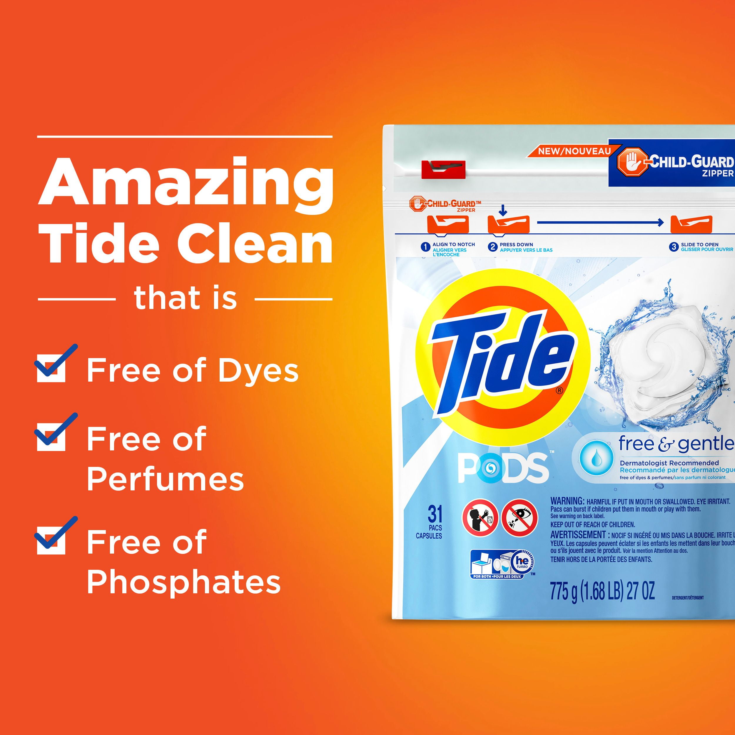 - Each pac of Tide Pods Free and Gentle provides a deeper clean (versus the leading Free detergent) that’s gentle on skin
