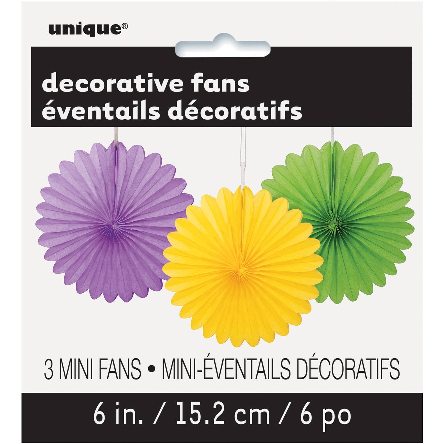 Unique Industries Fill your special celebration with color and charm using these delightful Bright Multicolor Tissue Paper Fan Decorations. Featuring one sunny yellow, one radiant purple, and one vibrant green, this trio of paper fans is ideal for decorating a bridal shower, luau party, or summer BBQ. Use the built-in string toppers to fasten them to the ceiling above a display table or inside a party tent. These decorative fans can also be hung on a door, in a window, or on a wall for an instant pop of color that will make your space look and feel more festive.